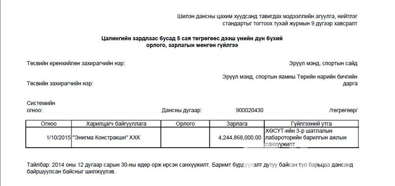 Доор харагдаж буй хүснэгтээс харахад ЭМСЯ 2015 оны нэгдүгээр сарын 10-нд ХӨСҮТ-ийн гуравдугаар шатлалын лабораторийн барилгын ажлыг санхүүжүүлэхээр 4 тэрбум 244 сая гаруй төгрөгийн гүйлгээ хийжээ.