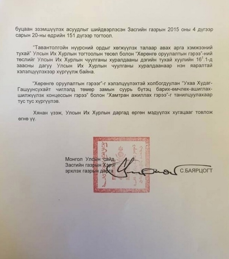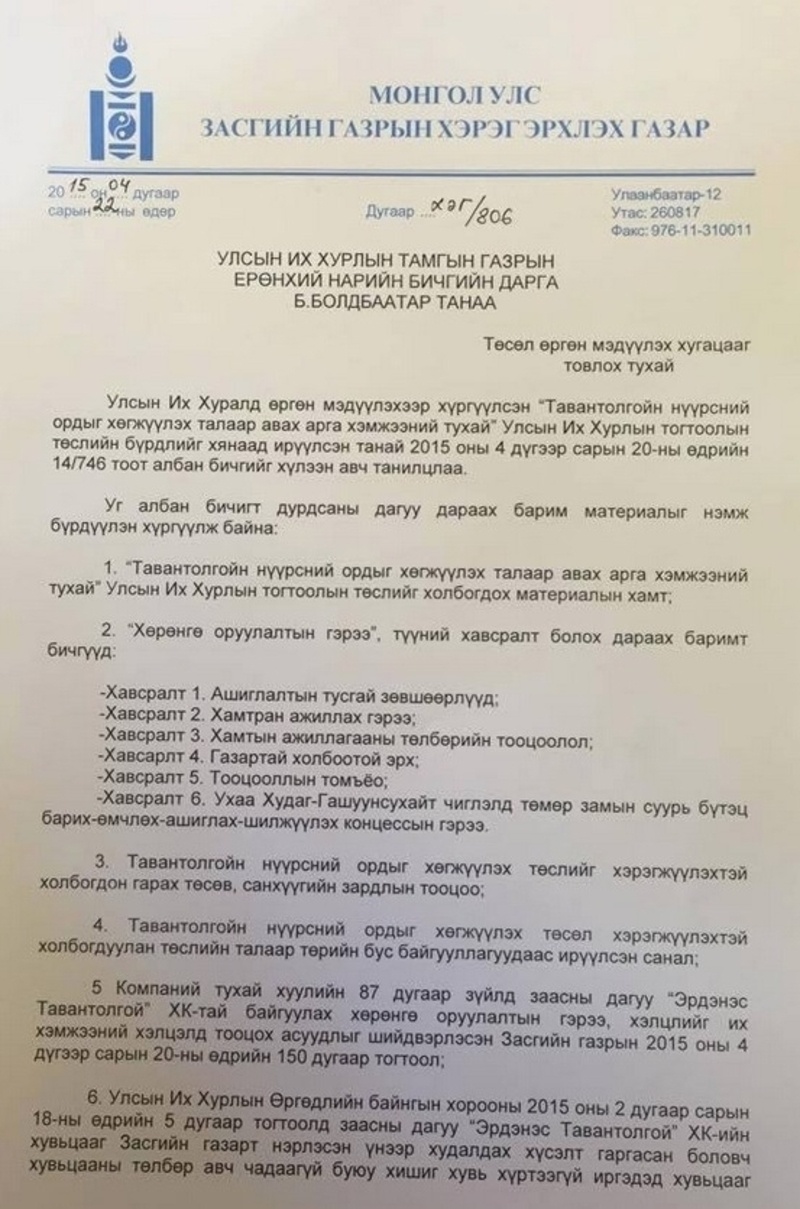 “Тавантолгойн нүүрсний ордыг хөгжүүлэх талаар авах арга хэмжээний тухай” УИХ-ын тогтоолын төсөл болон Хөрөнгө оруулалтын гэрээний төслийг чуулганы хуралдааны дэгийн тухай хуулийн дагуу УИХ-ын чуулганаар нэн яаралтай хэлэлцүүлэх, мөн “Хөрөнгө оруулалтын гэрээг” хэлэлцүүлэхтэй холбогдуулан “Ухаахудаг-Гашуунсухайт чиглэлд төмөр замын суурь бүтэц барих-өмчлөх-ашиглах-шилжүүлэх концессын гэрээ” болон “Хамтран ажиллах гэрээ”-г танилцуулахаар тус тус хүргүүллээ. УИХ-ын даргад өргөн мэдүүлэх хугацааг товлож өгөхийг тус бичигт дурдсан байна.