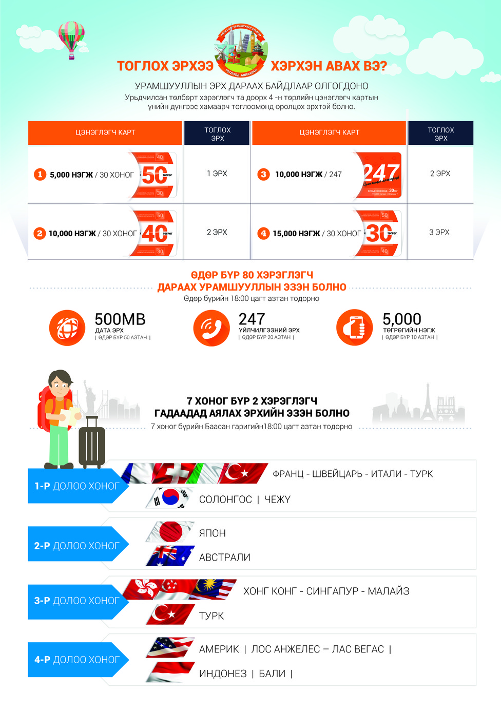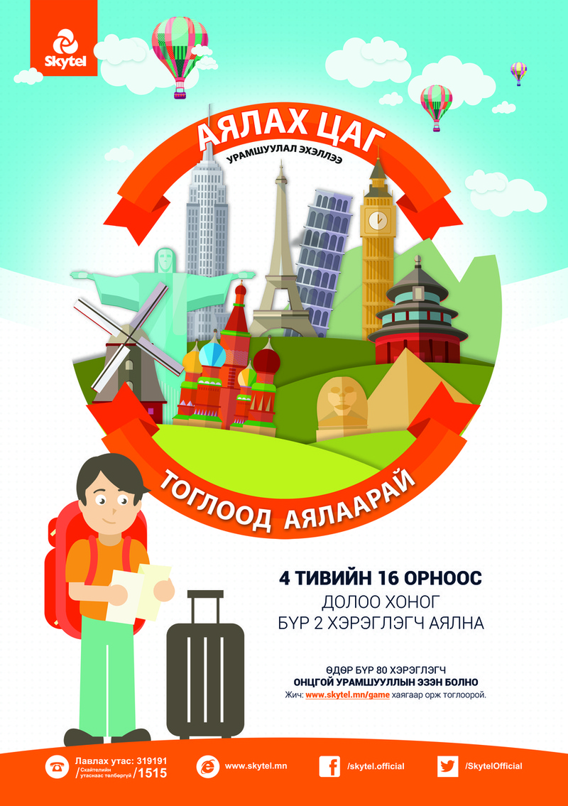 Скайтелийн урьдчилсан төлбөрт үйлчилгээний хэрэглэгчид оролцох боломжтой “АЯЛАХ ЦАГ” урамшуулал эхэлж нэгжийн цэнэглэлт хийсэн хүн бүр 7 хоног тутам 4 тивийн 16 орноор аялах 2 хэрэглэгчийн нэг болох боломжтой боллоо.