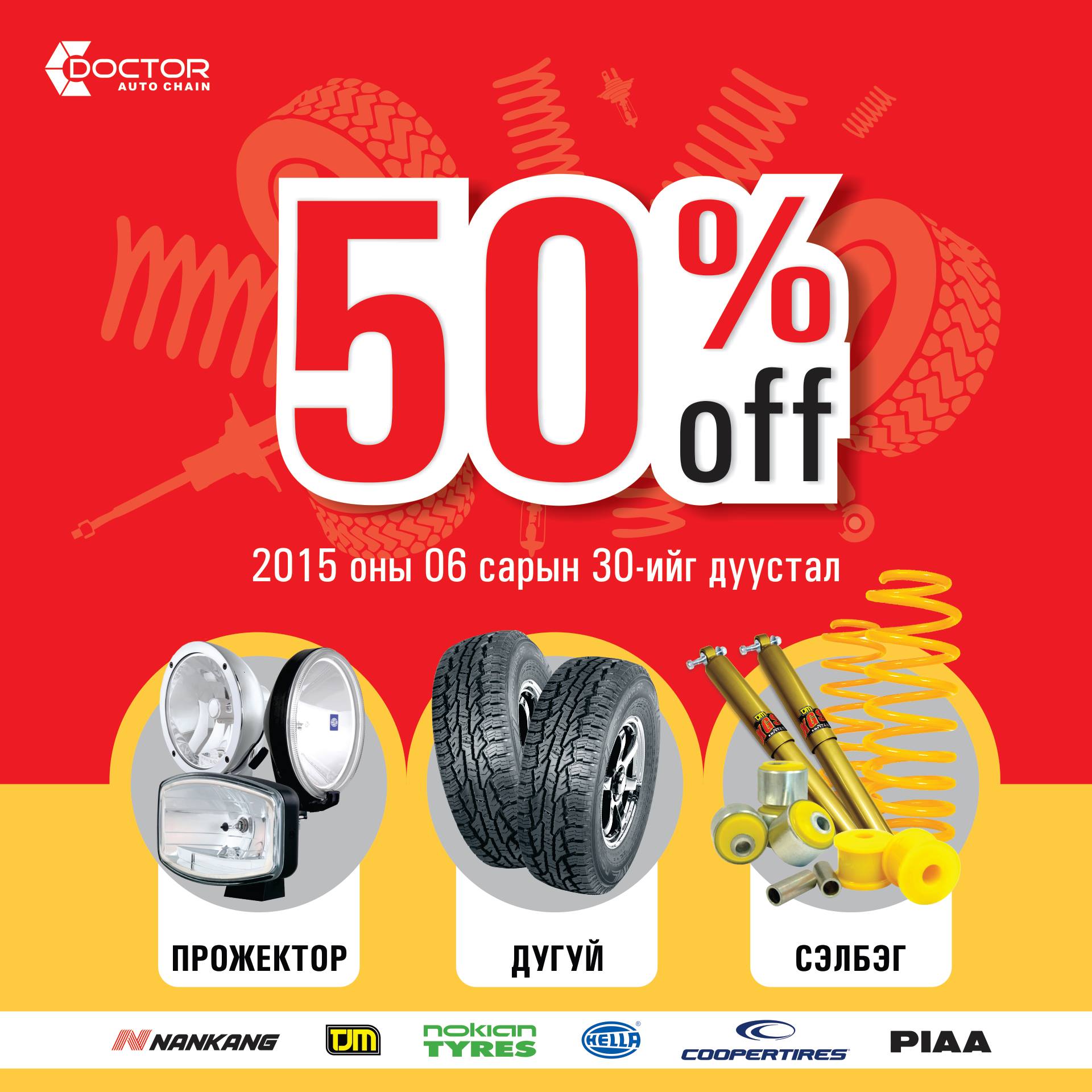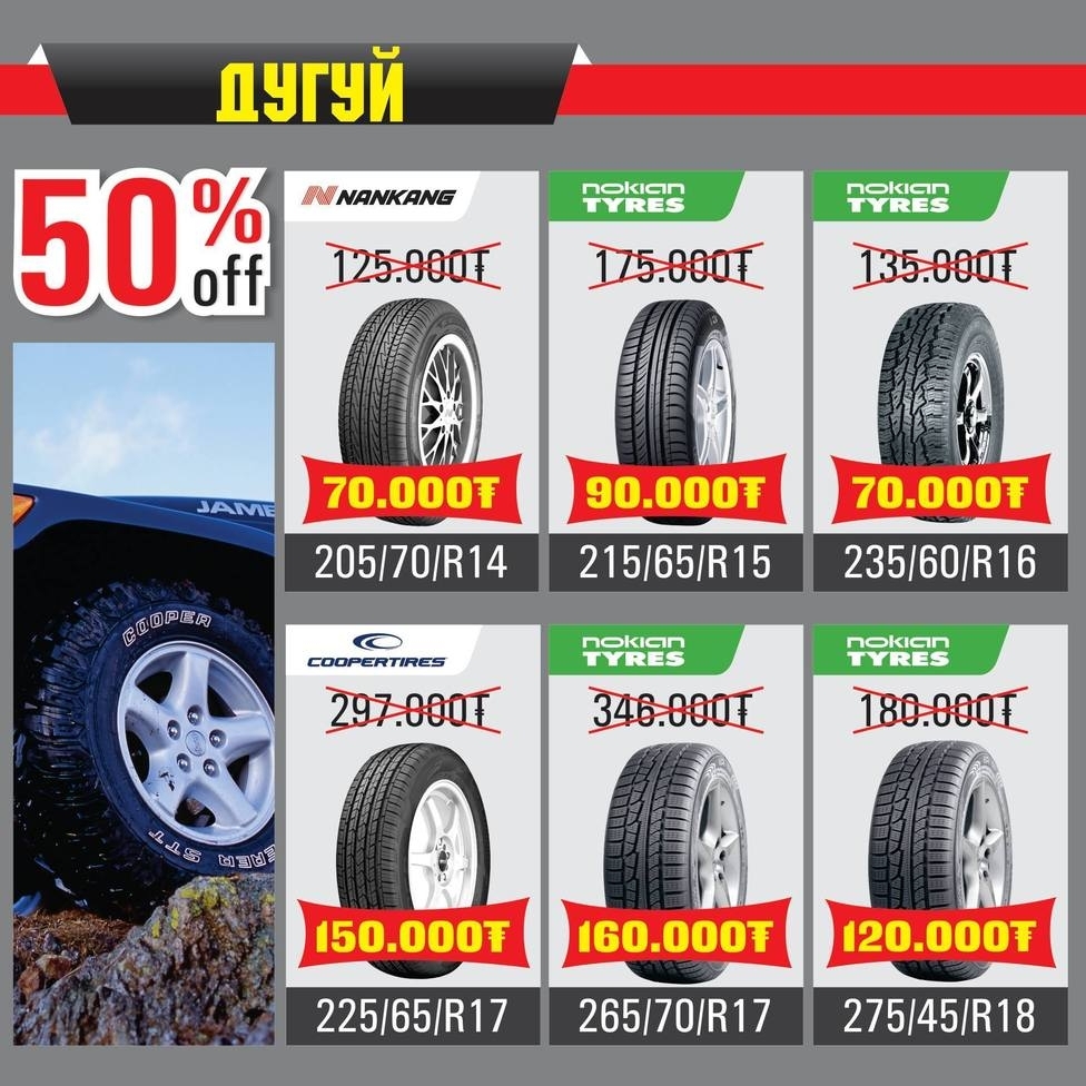 Энэхүү хямдралын аянд Nankang (Тайвань), TJM (Австрали), Nokian Tyres (Финланд), Hella (Герман), Coopertires (АНУ), PIAA (Япон) брэндүүд нэгдэж танд доорх бараануудыг 50% хямд үнээр санал болгож байна.