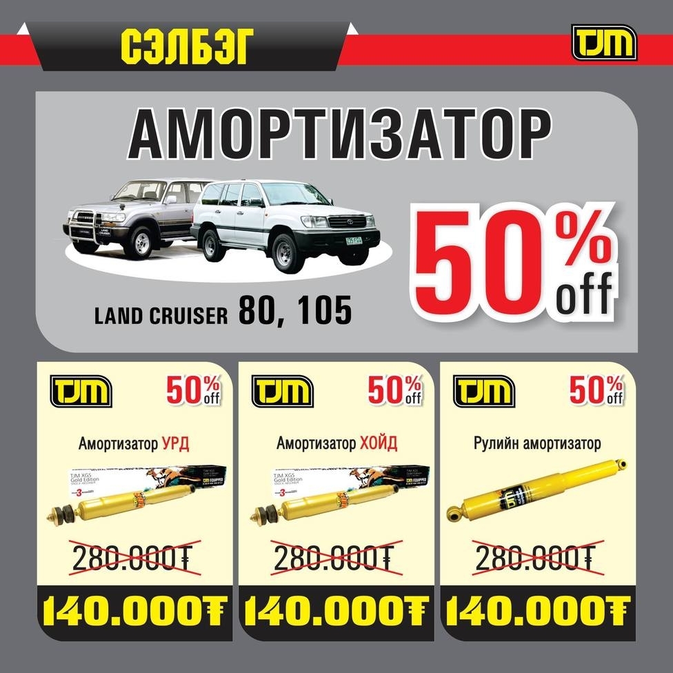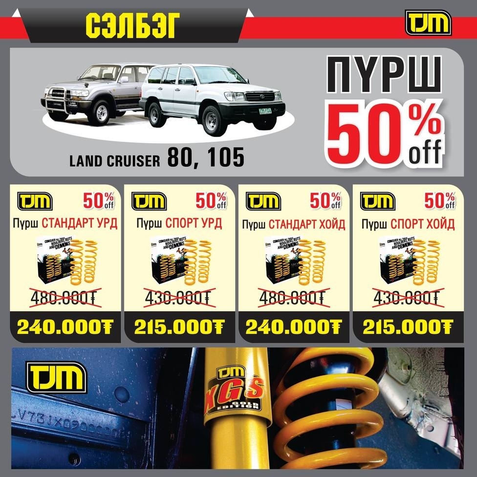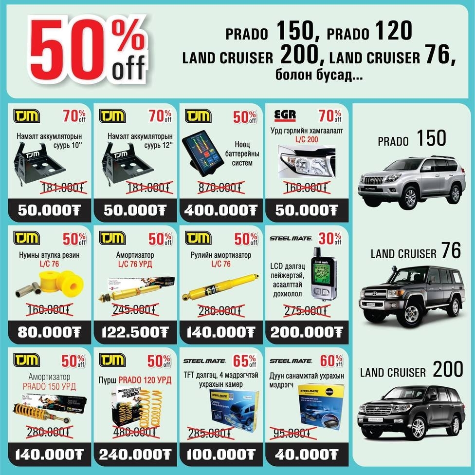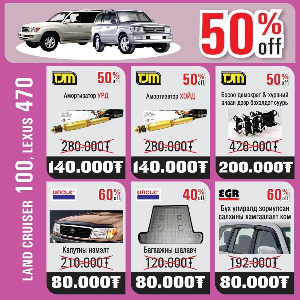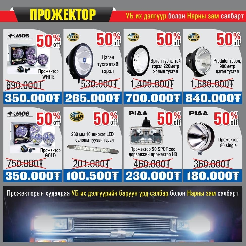 Энэ сарыг дуустал таны аяллын бэлтгэлд зориулж ХЭРЭГЦЭЭТЭЙ сэлбэг, дугуй, прожекторын үнийг 50% хямдрууллаа.