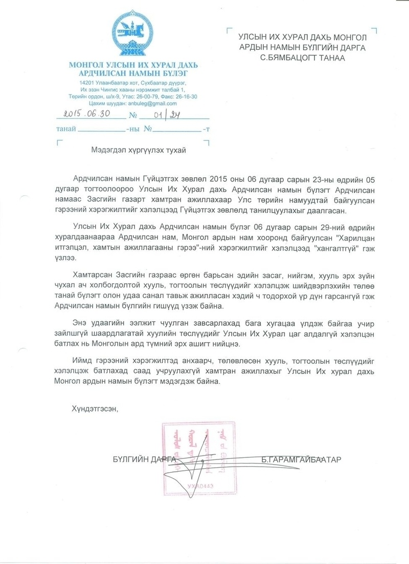 Ардчилсан намын Гүйцэтгэх зөвлөл 2015 оны 06 дугаар сарын 23-ны өдрийн 05 дугаар тогтоолоороо Улсын Их Хурал дахь Ардчилсан намын бүлэгт Ардчилсан намаас Засгийн газарт хамтран ажиллахаар Улс төрийн намуудтай байгуулсан гэрээний хэрэгжилтийг хэлэлцээд Гүйцэтгэх зөвлөлд танилцуулахыг даалгасан.
