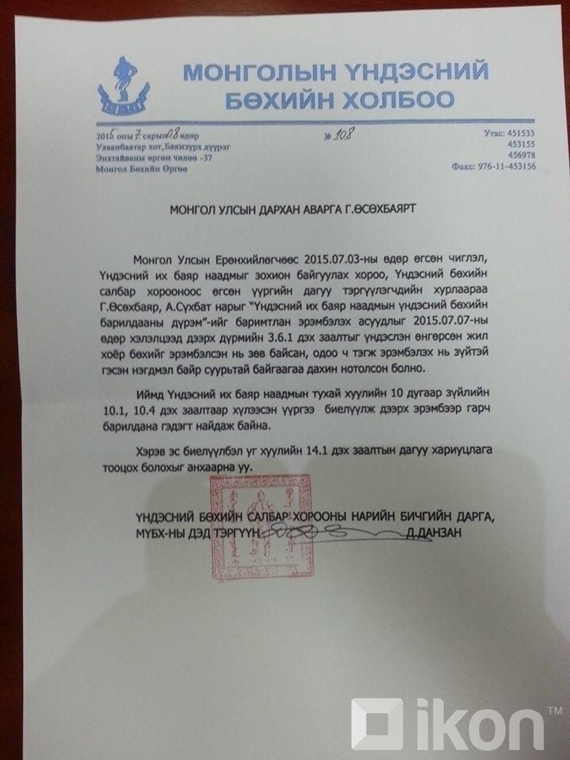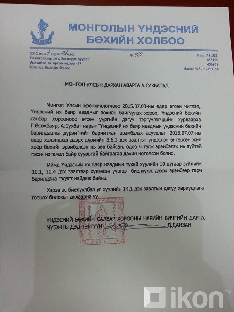 МҮБХ-ноос хоёр аваргад дараах албан бичгийг хүргүүлжээ.