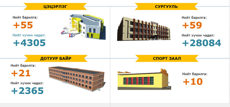 2015 онд Улсын төсвийн санхүүжилтээр БСШУ-ны салбарт нийт 191 барилга баригдаж байна. Эдгээрийн 55 цэцэрлэг, 59 сургууль, 21 дотуур байр, 10 спорт заал, хоёр их засвар, зургаан их, дээд сургууль, гурван шинжлэх ухаан, 30 соёлын, бусад 5 барилга байна.