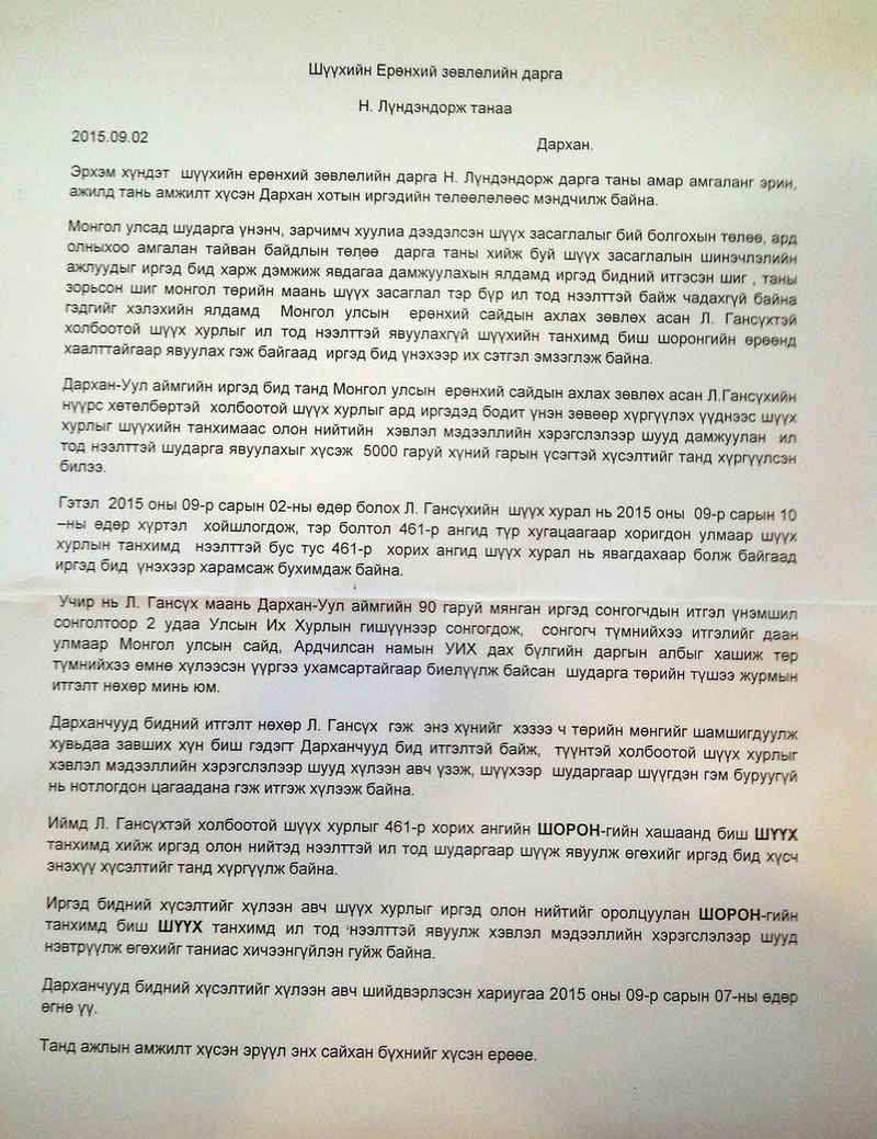 Дархан-Уул аймгийн иргэдийн ШЕЗ-ийн дарга Н.Лүндэндоржид хүргүүлсэн хүсэлт