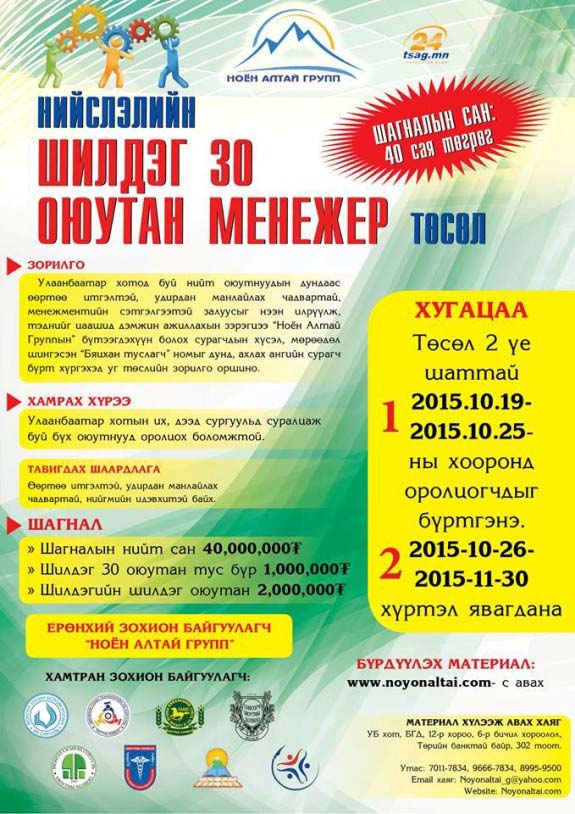 Нийслэлийн хэмжээнд үйл ажиллагаа явуулдаг бүх их, дээд сургуулийн оюутнуудын дунд “ШИЛДЭГ 30 ОЮУТАН МЕНЕЖЭР” төслийг “Ноён Алтай Групп”-с зохион байгуулах гэж байгаа тухай тус компаний маркетингийн албаны дарга Е.Эрболдтой ярилцлаа.