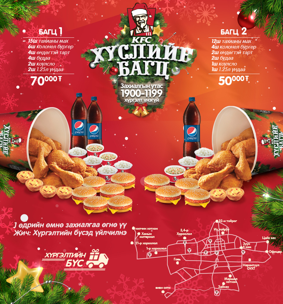 KFC-ийн хамт олон шинэ жилийн баярыг тохиолдуулан амтат шарсан тахиатай “Хүслийн багц” –ыг 12 сарын 2-с эхлэн хаягаар тань хүргэж өгч эхэллээ.