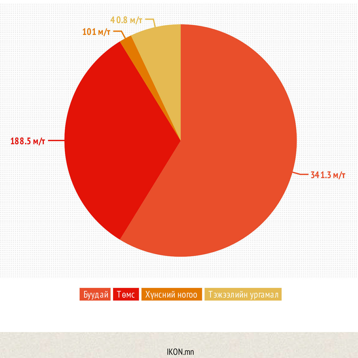 Манай улс энэ жил 341.3 мянган тонн буудай, 188.5 мянган тонн төмс, 101 мянган тонн хүнсний ногоо, 40.8 мянган тонн тэжээлийн ургамал хураагаад байна.