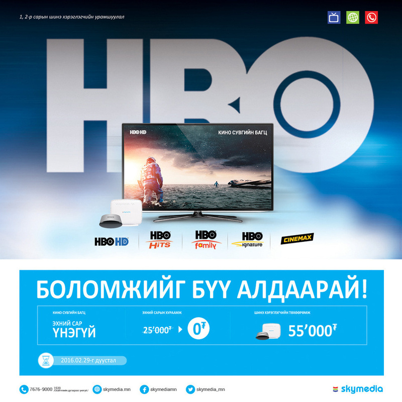 Гуравласан үйлчилгээний одоогийн үнэнч хэрэглэгчид HBO-н сувгуудыг багтаасан Кино сувгийн багцыг 2016 оны 1-р сарыг дуустал үнэ төлбөргүй үзэж байна. Шинээр Гуравласан үйлчилгээний хэрэглэгч болбол та HBO-н нийт 5 сувгийг эхний 1 сарын турш үнэгүй үзэх, шинэ хэрэглэгчийн төхөөрөмжөө хямдралтай үнээр авах, мөн эхний сар суурь хураамж төлөлгүй ашиглах эрхийн эзэн болно.
