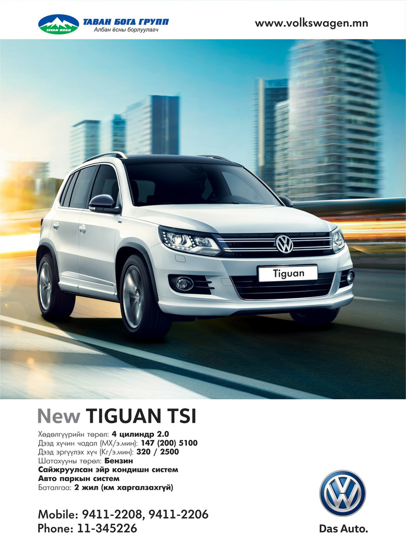 Хэрэгцээ боломжоо ухаалгаар мэдэрч, амьдралаа үргэлж аз жаргалаар бялхуулж байдаг тэр л эрхэмсэг Таны хүсэл боломж нэгдэх тэр л ертөнцөд Фольксваген Тигуан.