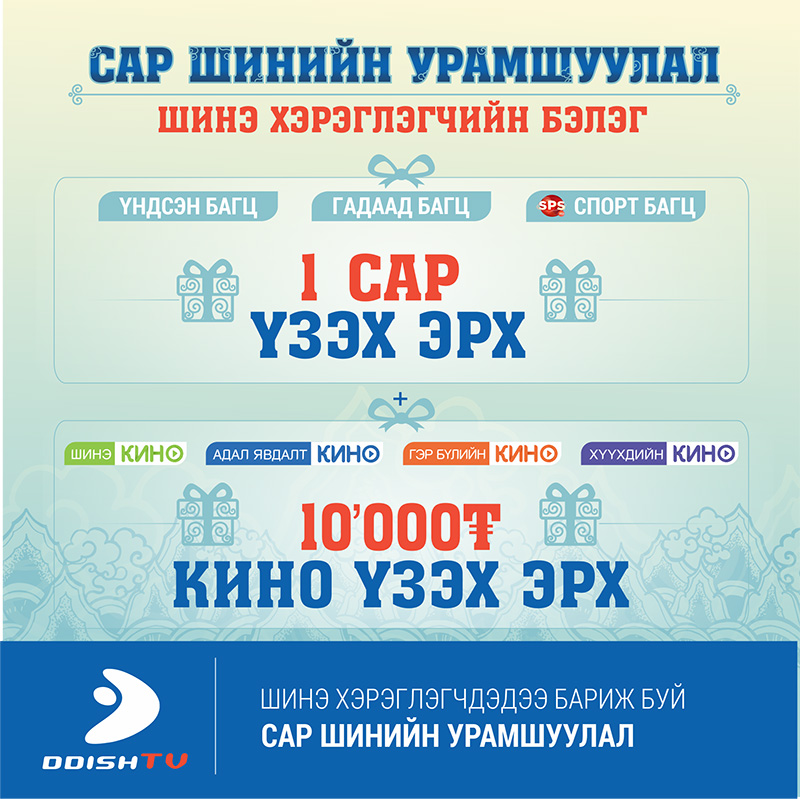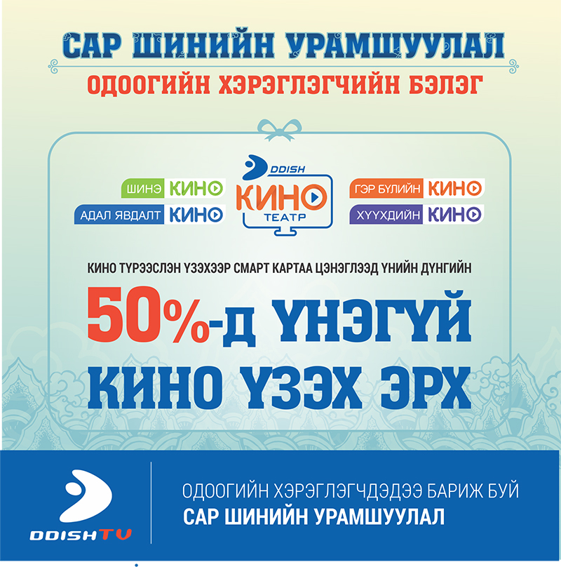 2016.01.08-02.08ны хооронд кино түрээслэн үзэхээр ДДэш Смарт картаа цэнэглэсэн хэрэглэгч бүртээ цэнэглэсэн үнийн дүнгийнхээ 50%-д нь кино сангийн сувгуудаас кино ҮНЭГҮЙ ҮЗЭХ ЭРХ БЭЛЭГЛЭЖ БАЙНА.