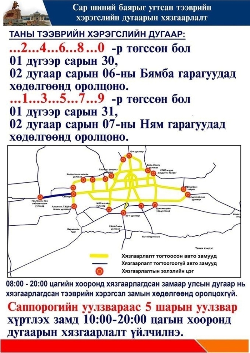 Иймээс иргэдийн цагийг хэмнэх, ачааллыг бууруулах зорилгоор 2013 оноос хойш сар шинийн баярын өмнөх өдрүүдэд замын хөдөлгөөний түр зохицуулалт хийдэг болсон билээ.