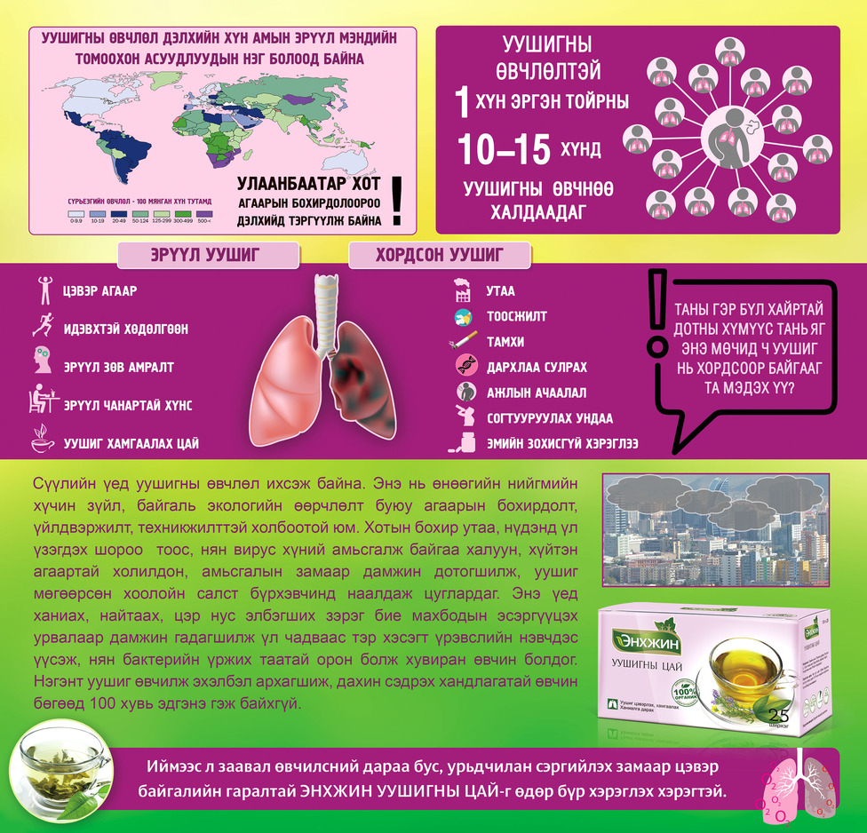 Та өдөрт 250 төгрөгөөр 1 ширхэг Энхжин- уушигны цайг өдөр бүрийн ундандаа тогтмол хэрэглэснээр уушигны хорт хавдраас гэр бүлийн гишүүдээ урьдчилан сэргийлэх боломжтой.