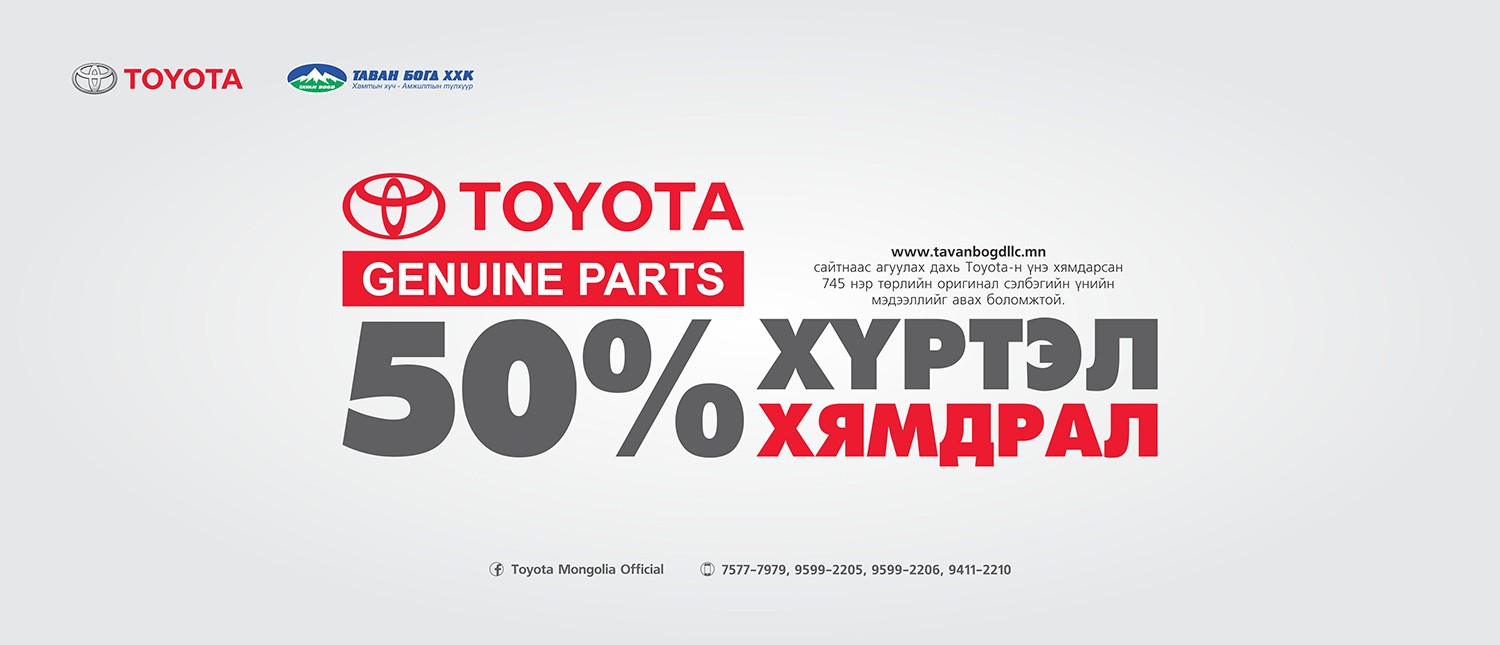“Таван Богд” ХХК-ийн Toyota албан ёсны засвар үйлчилгээний төв 745 нэр төрлийн оригинал Toyota сэлбэгэнд 50% хүртэл хямдрал зарлалаа.