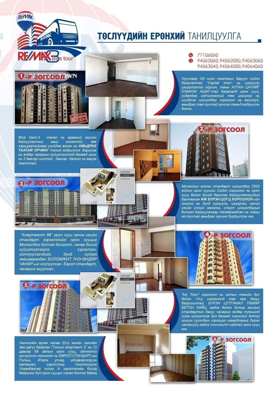 Улаанбаатар хотын хурдацтай хөгжин тэлж байгаа энэ цаг үед өөрийн бодит хэрэгцээнд бүхий л талаараа нийцэх орон сууцыг хайж олох нь цаг хугацаа болон зардал шаардсан ажил байдаг. Тэгвэл та амралтын өдрүүдээр өөрийн сонирхож буй барилгын төслүүдээр зочлон өөрт хэрэгтэй бүхий л мэдээллээ нэг дороос авах боломжтой Автобустай аялалыг РеМакс Монголиа зөвхөн таньд зориулан зохион байгуулдагийг мэдэх үү.