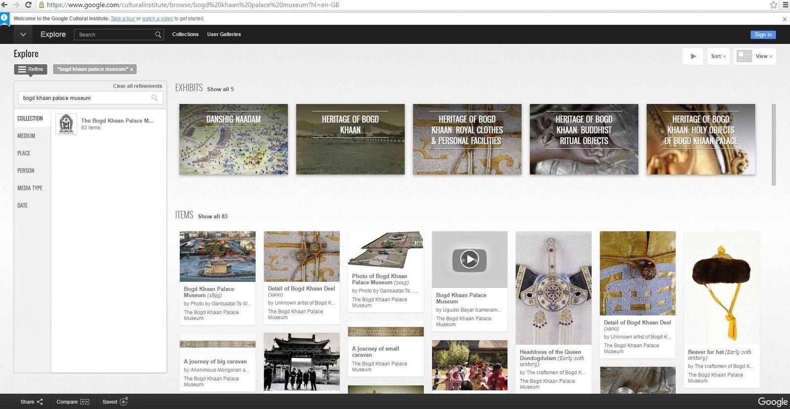 Мөн цахим үзэсгэлэнгээ Google-ийн Соёлын хүрээлэн дээр гаргаад байгаа юм байна. Google компаний Соёлын хүрээлэн /Cultural Institute/-ийн санд 60 улсын 600 хамтрагчид оролцож 700 дижитал үзэсгэлэнг гаргаж байгаа ажээ.