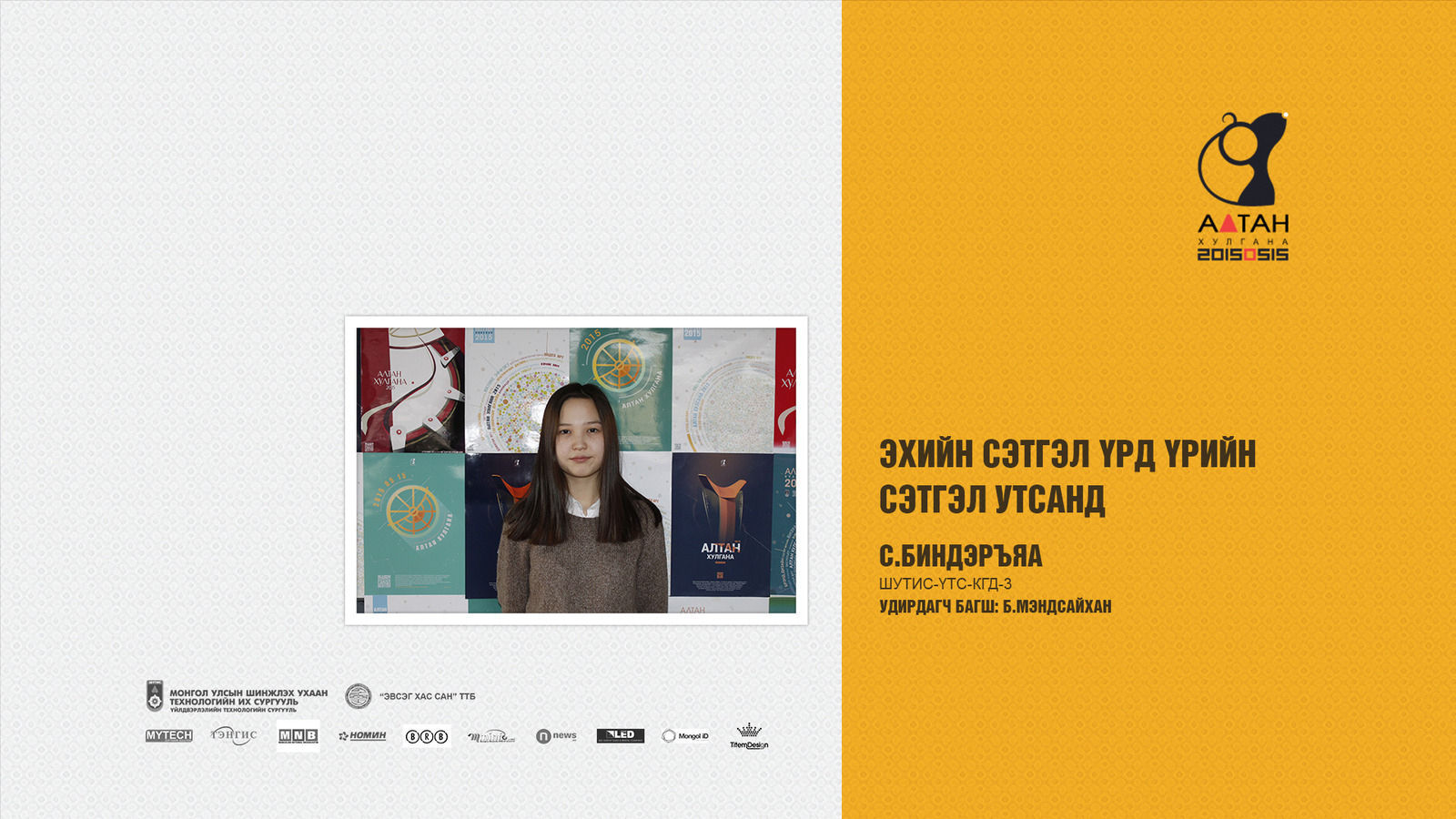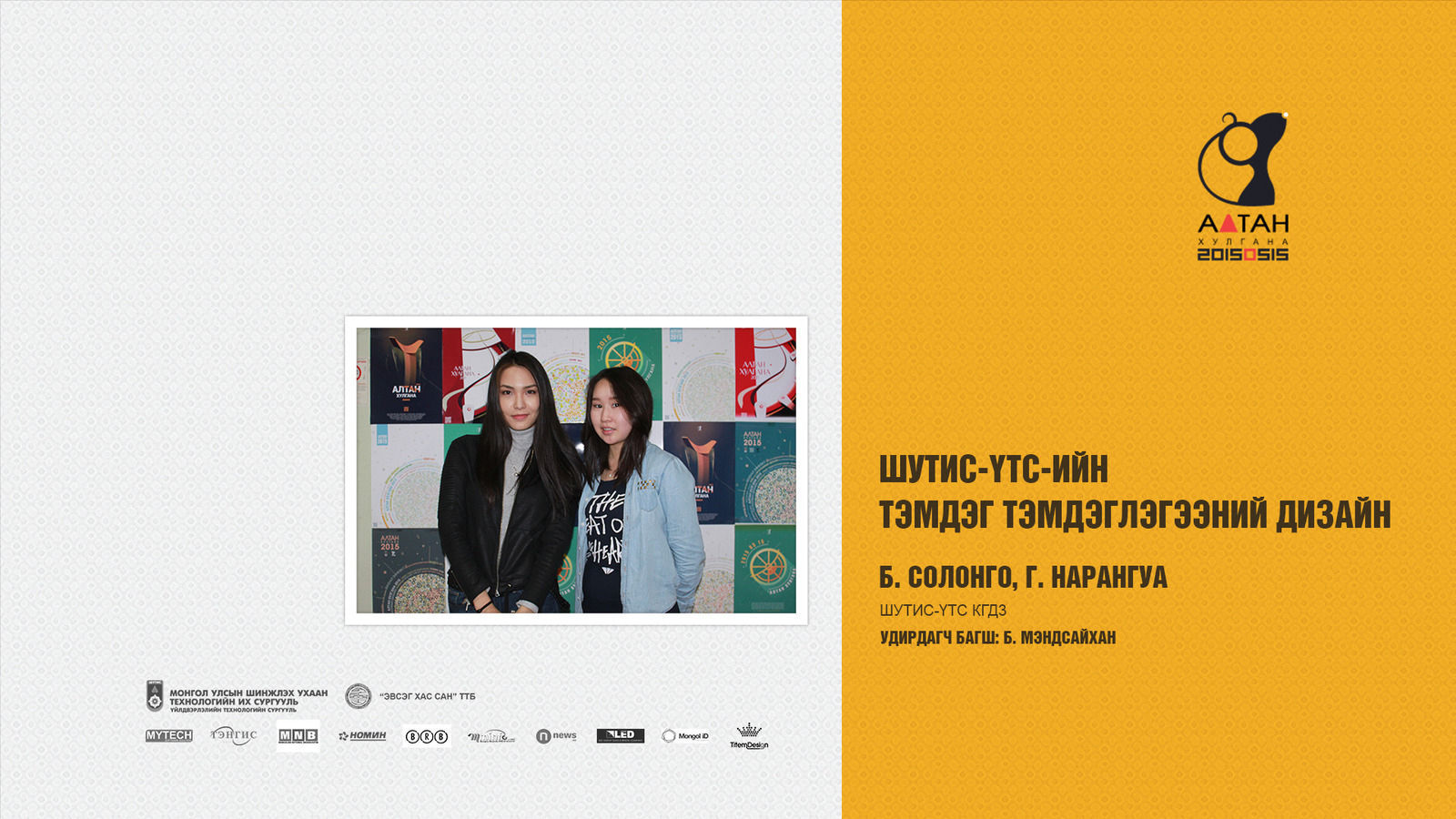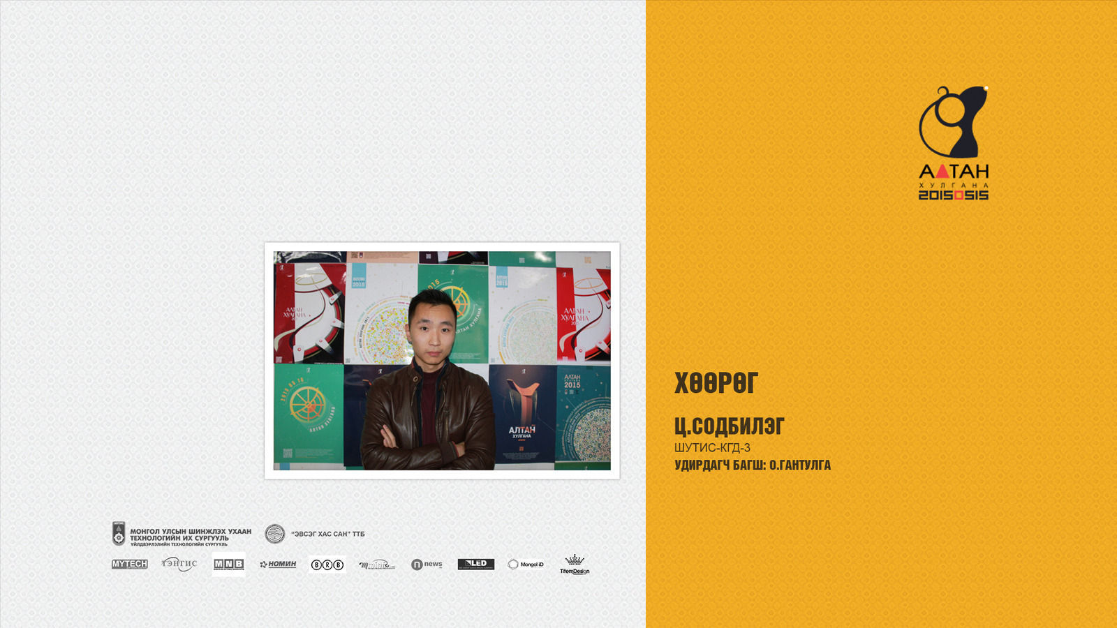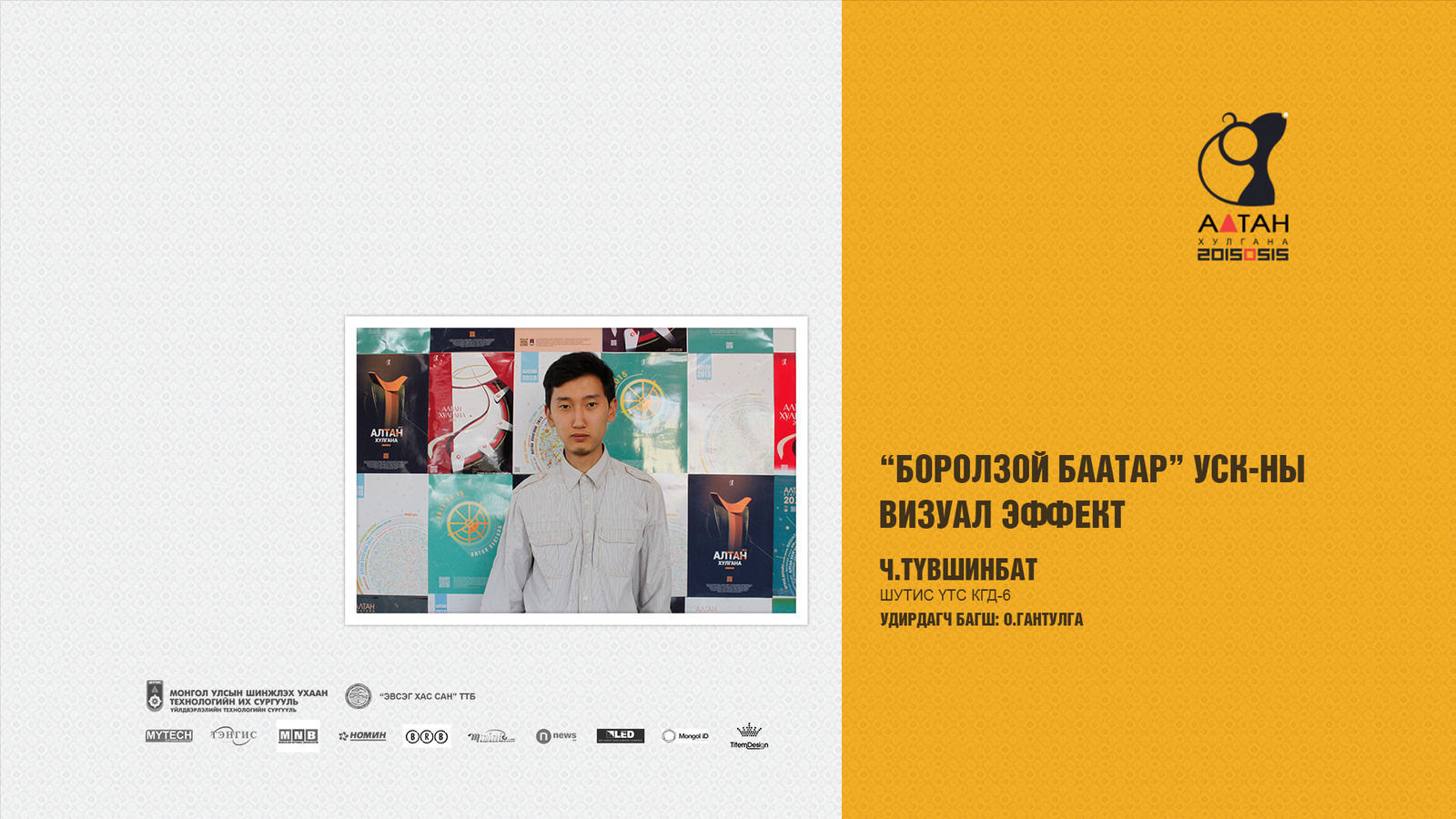 Жил бүр зохиогддог Алтан хулгана тэмцээн нь оюутан залууст өөрсдийн мэдлэг, ур чадвараа харуулах маш том боломж олгодог тэмцээн юм шиг санагддаг. Яагаад гэвэл Дизайны чиглэлээр бүх нийтийг хамарсан тэмцээн байгаа болохоор их баяртай байна. Бид өөрсдийн бүтээл дээрээ шинэ өнгө аяс, эвлүүлэг, маш олон үзэгдэл болгоны хоорондох холбоосыг нэгтгэн “Би Чи Бид” гэсэн агуулгыг харуулах зорилготой байсан.