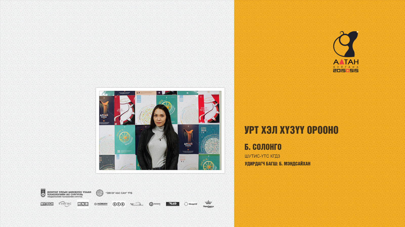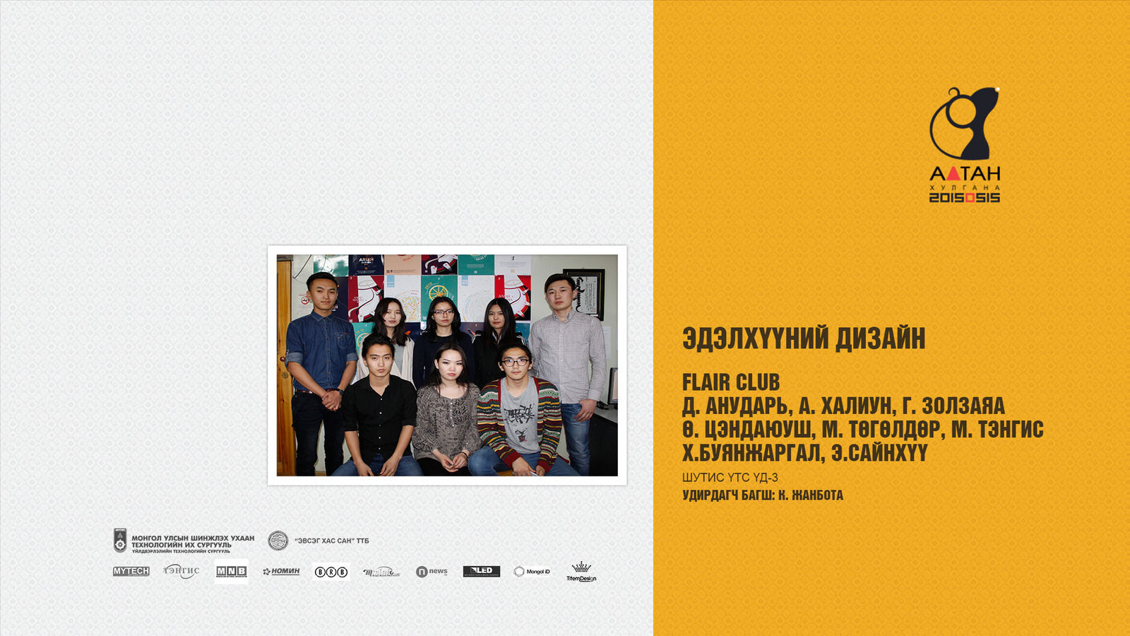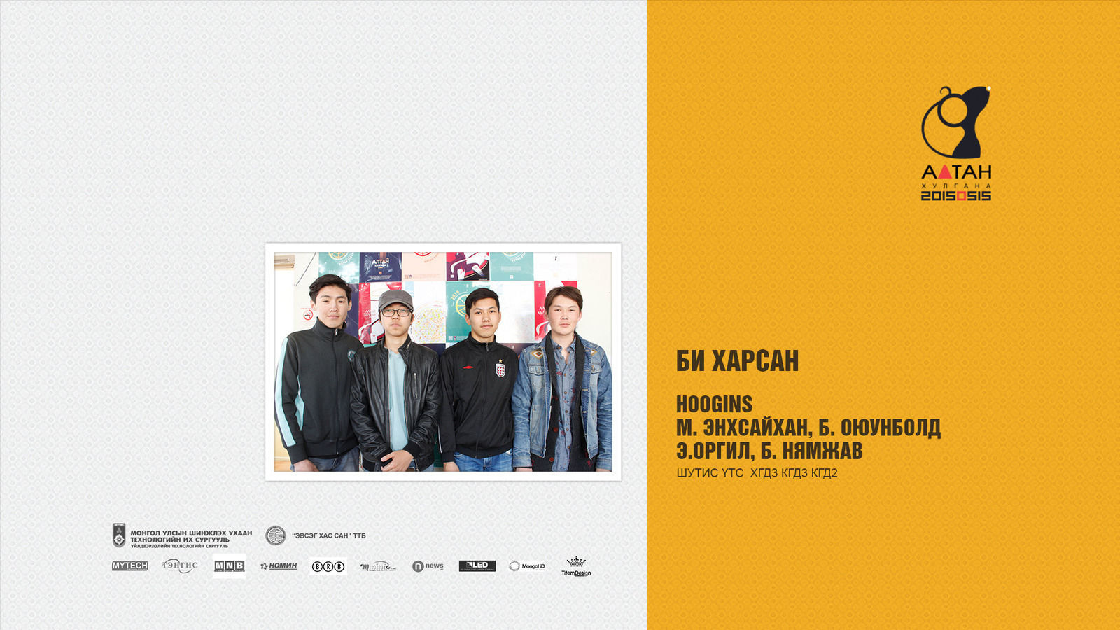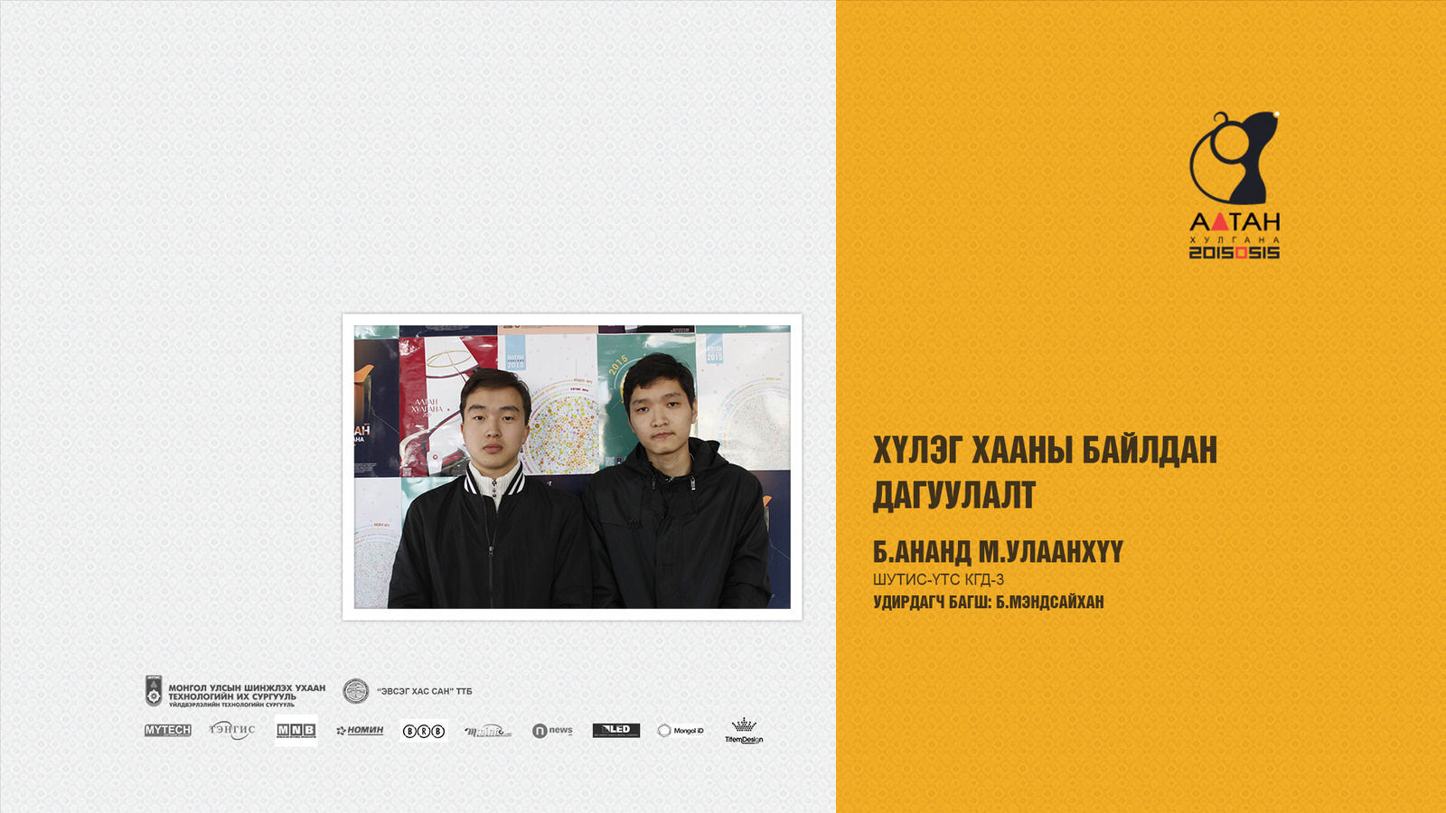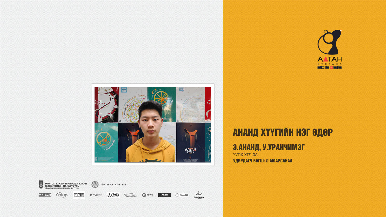 Жил бүр зохиогддог Алтан хулгана тэмцээн нь оюутан залууст өөрсдийн мэдлэг, ур чадвараа харуулах маш том боломж олгодог тэмцээн юм шиг санагддаг. Яагаад гэвэл Дизайны чиглэлээр бүх нийтийг хамарсан тэмцээн байгаа болохоор их баяртай байна. Бид өөрсдийн бүтээл дээрээ шинэ өнгө аяс, эвлүүлэг, маш олон үзэгдэл болгоны хоорондох холбоосыг нэгтгэн “Би Чи Бид” гэсэн агуулгыг харуулах зорилготой байсан.