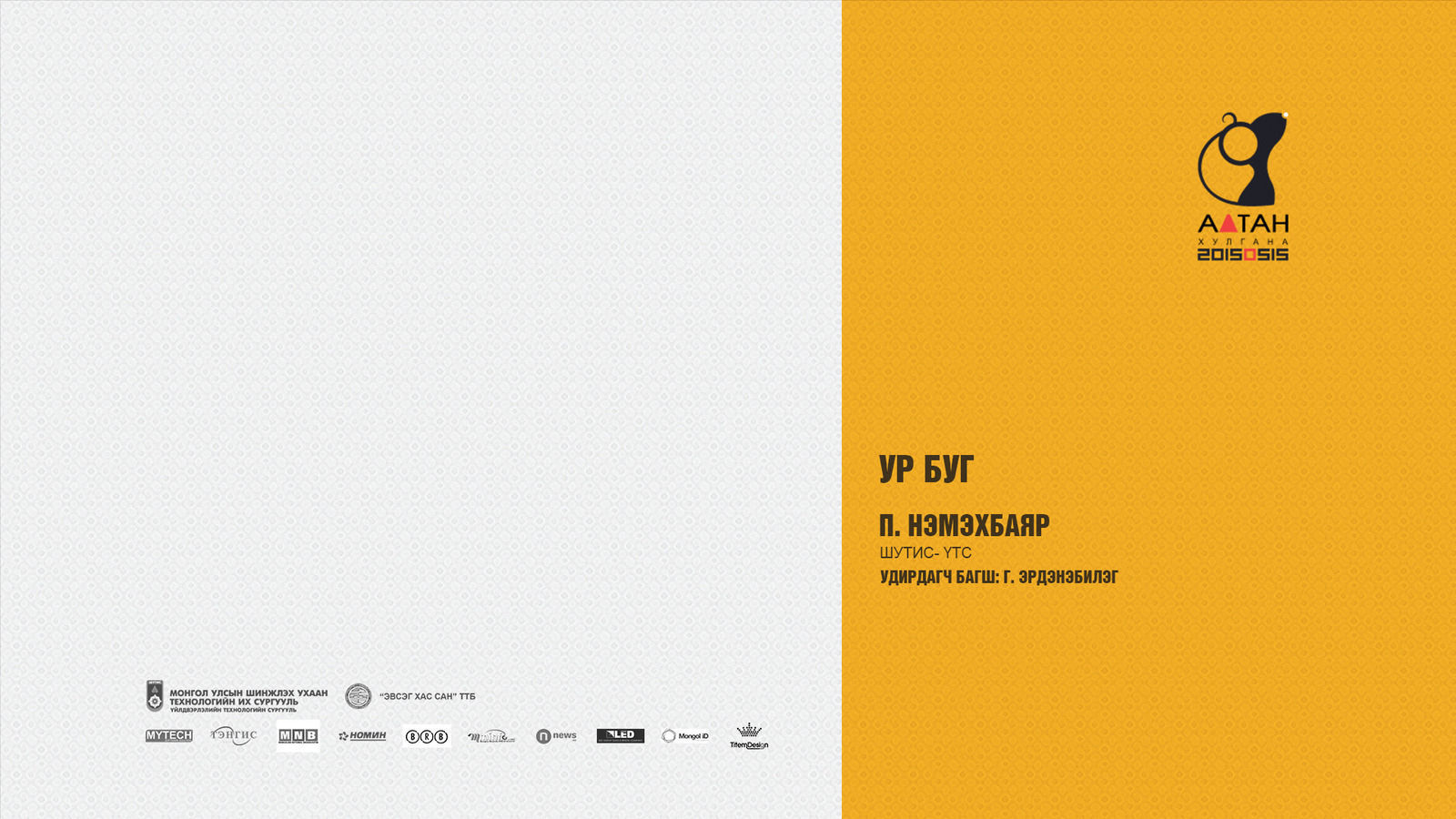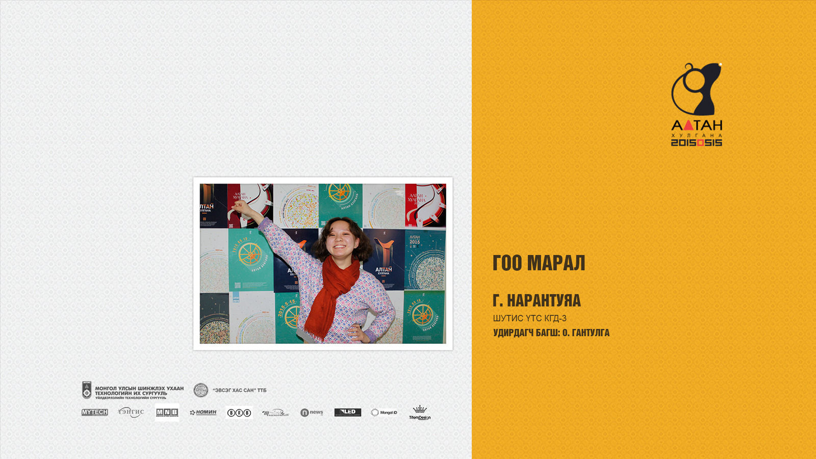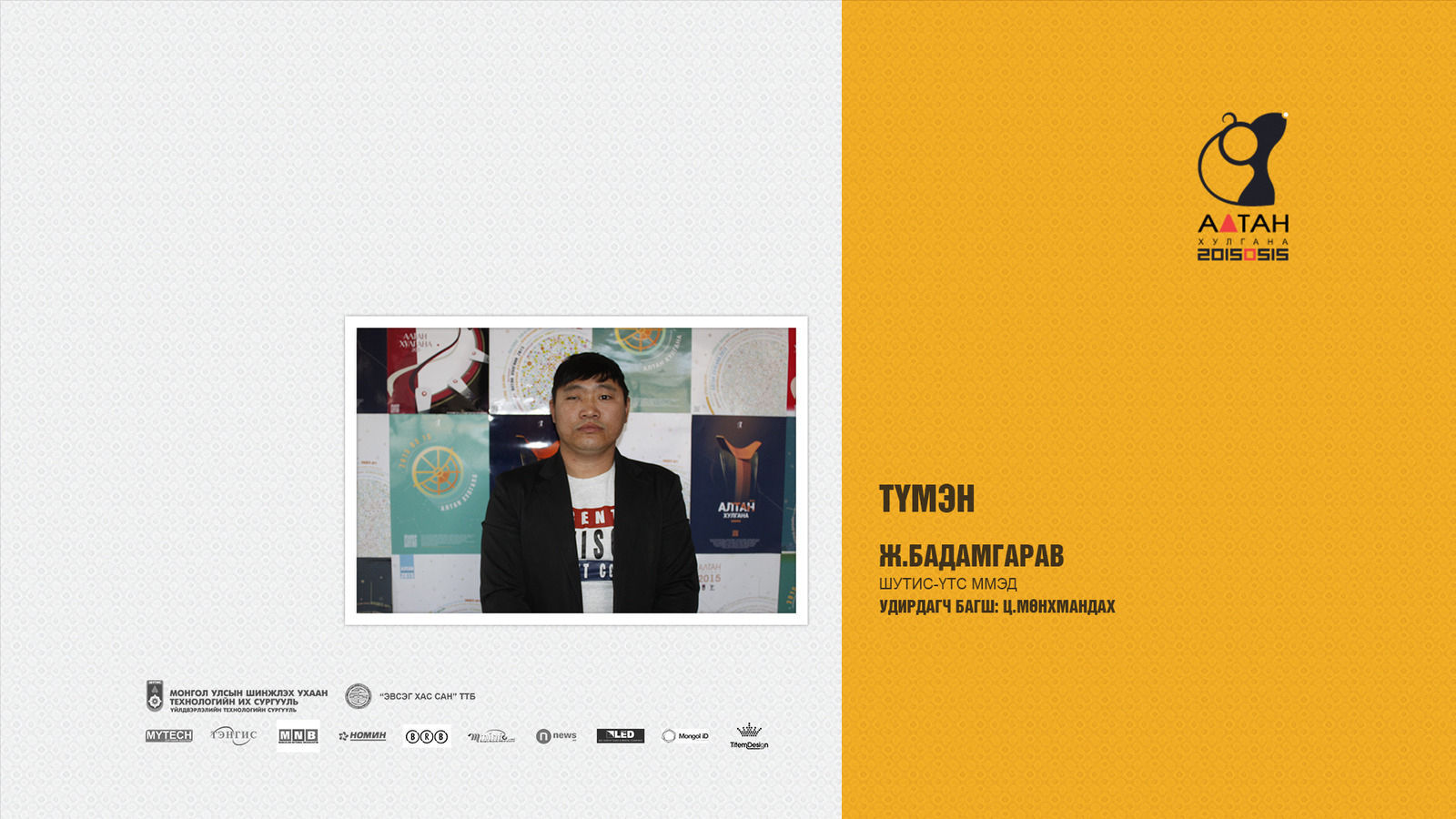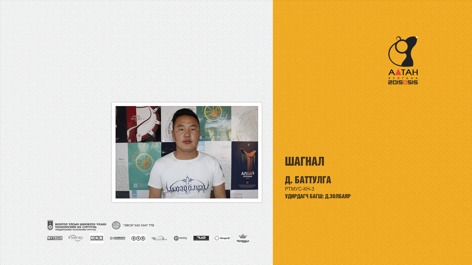 Жил бүр зохиогддог Алтан хулгана тэмцээн нь оюутан залууст өөрсдийн мэдлэг, ур чадвараа харуулах маш том боломж олгодог тэмцээн юм шиг санагддаг. Яагаад гэвэл Дизайны чиглэлээр бүх нийтийг хамарсан тэмцээн байгаа болохоор их баяртай байна. Бид өөрсдийн бүтээл дээрээ шинэ өнгө аяс, эвлүүлэг, маш олон үзэгдэл болгоны хоорондох холбоосыг нэгтгэн “Би Чи Бид” гэсэн агуулгыг харуулах зорилготой байсан.