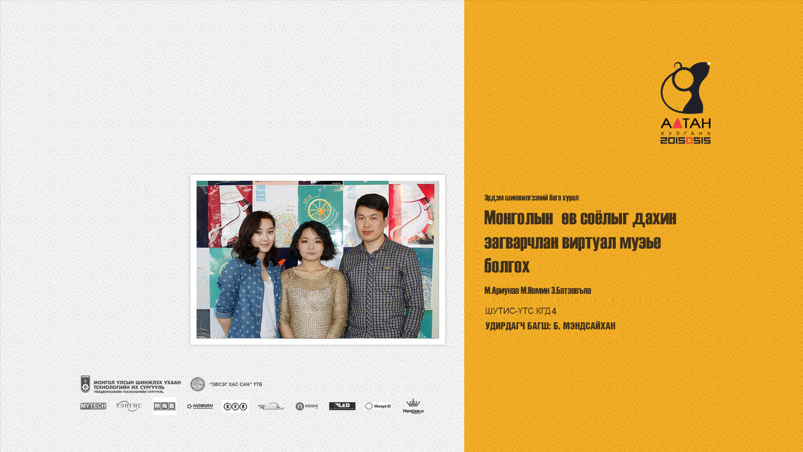 1. Эрдэм шинжилгээний бага хурлын илтгэл –ШУТИС-ҮТС М.Ариунаа, М.Номин, Э.Батзавьяа “Монголын өв соёлыг дахин загварчлан виртуал музей болгох”
