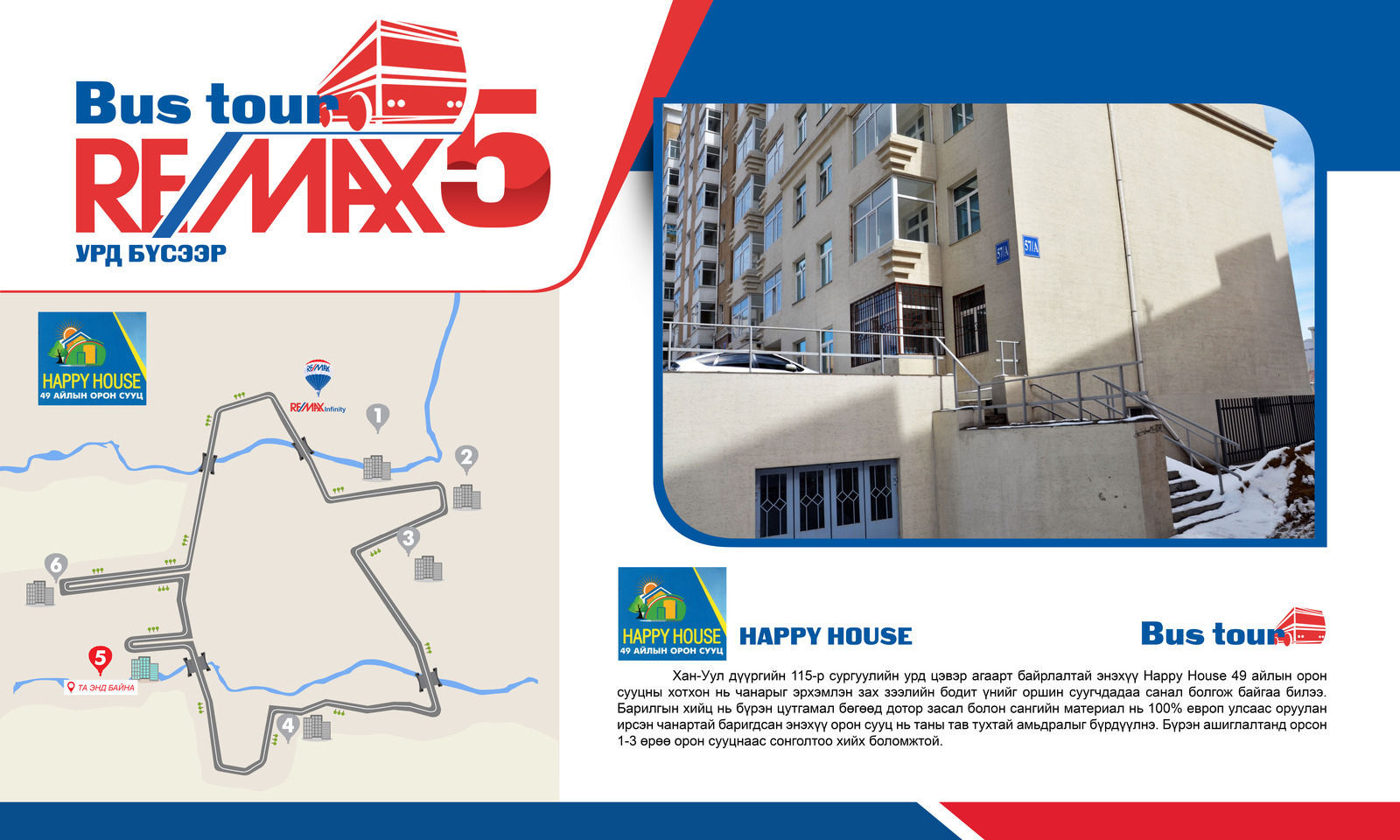 Тэгвэл та амралтын өдрүүдээр өөрийн сонирхож буй барилгын төслүүдээр зочлон өөрт хэрэгтэй бүхий л мэдээллээ нэг дороос авах боломжтой үл хөдлөх хөрөнгө танилцуулах Автобустай аялалыг RE/MAX Mongolia зөвхөн таньд зориулан 4 сарын 30 нд 5 дахь удаагаа зохион байгууллаа. Өнгөрсөн оны 10 сард албан ёсоор нээлтээ хийсэн Ремакс Монголиа үл хөдлөх хөрөнгө зуучлалын компани хэрэглэгчдэдээ зориулан Монголд анх удаа энэхүү автобустай аялалыг зохион байгуулснаас хойш нийт 390 гаруй хэрэглэгчид хамрагджээ.