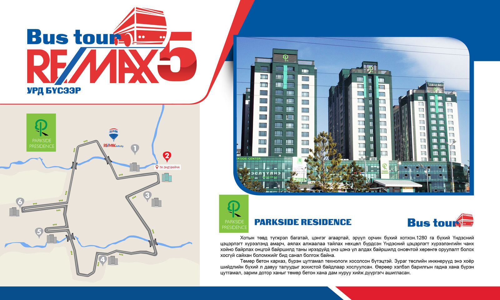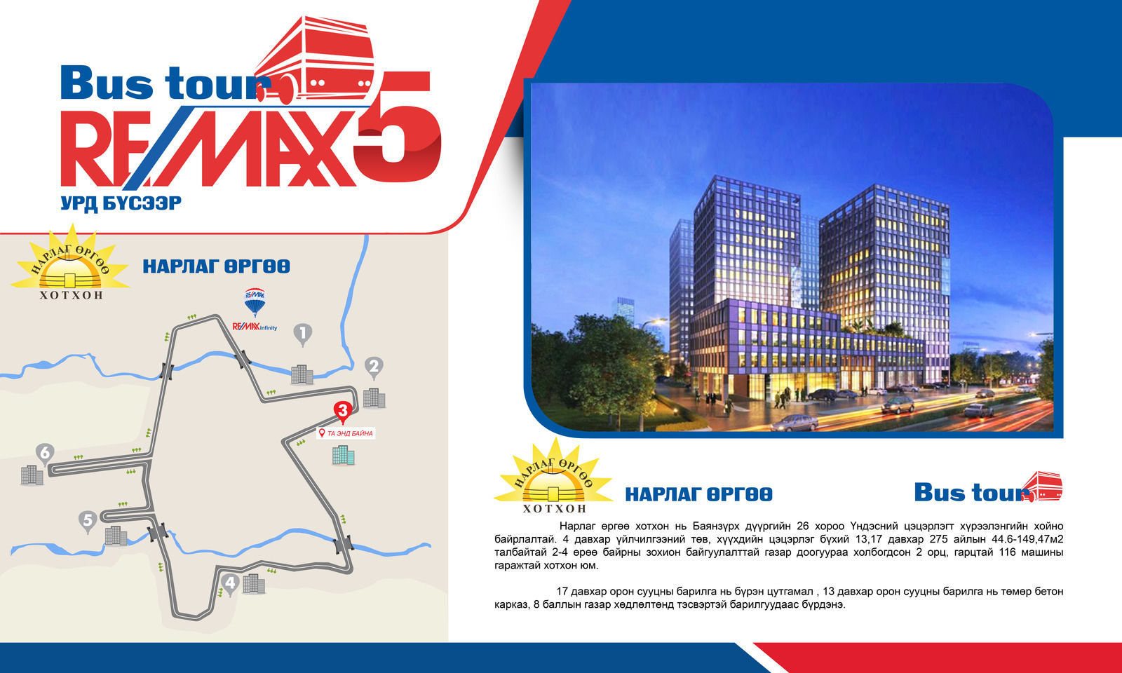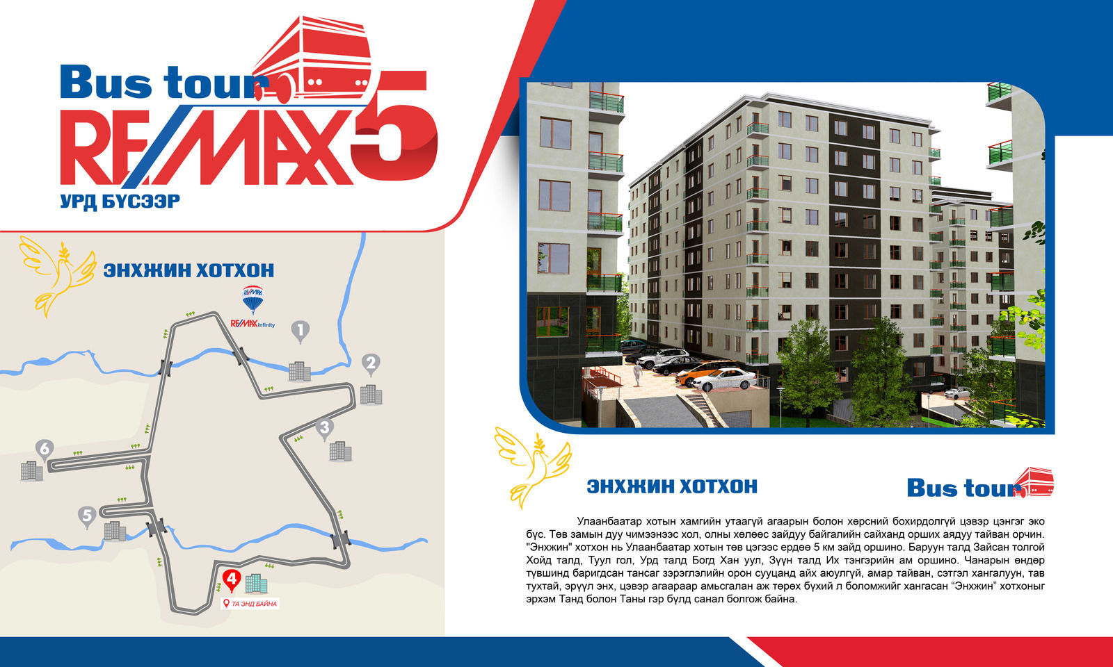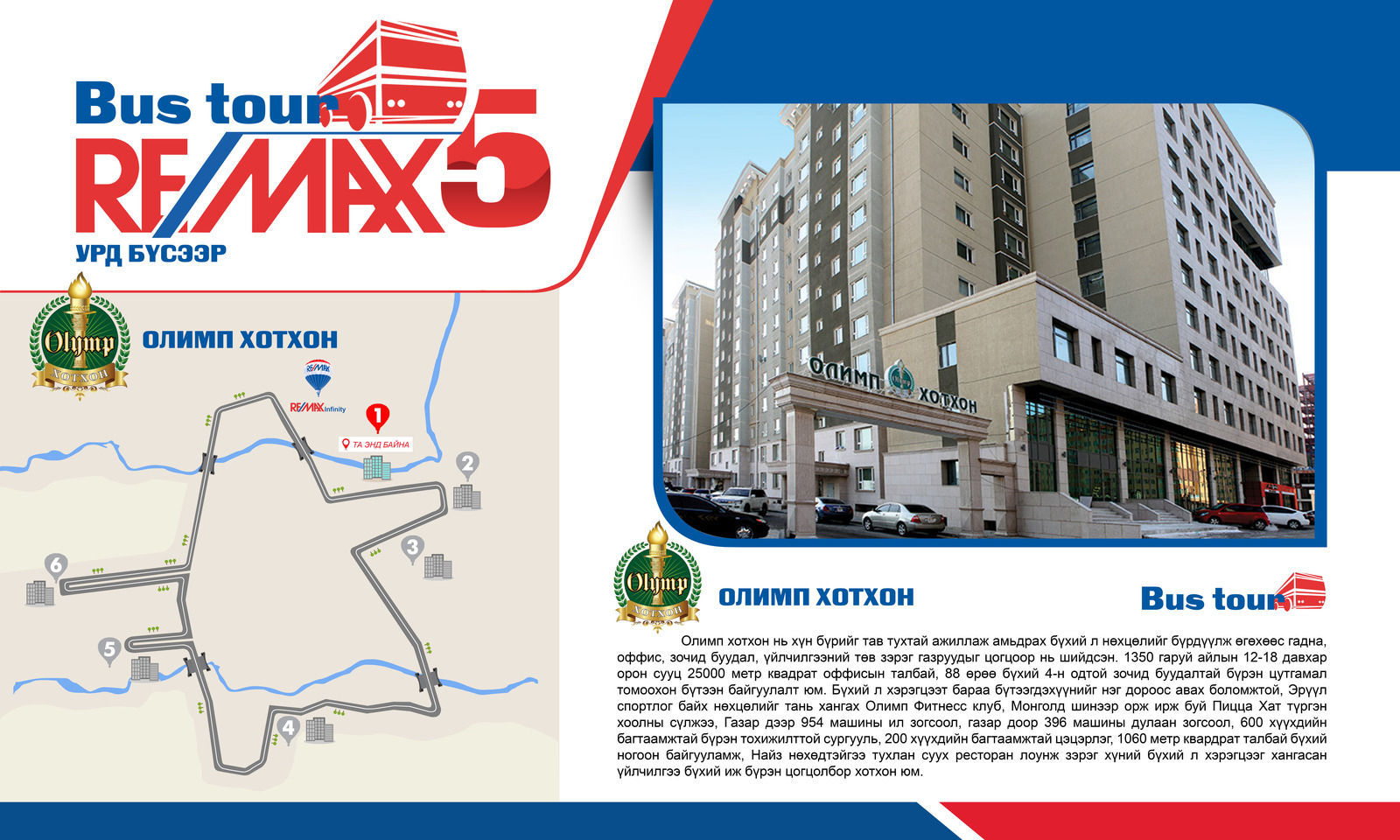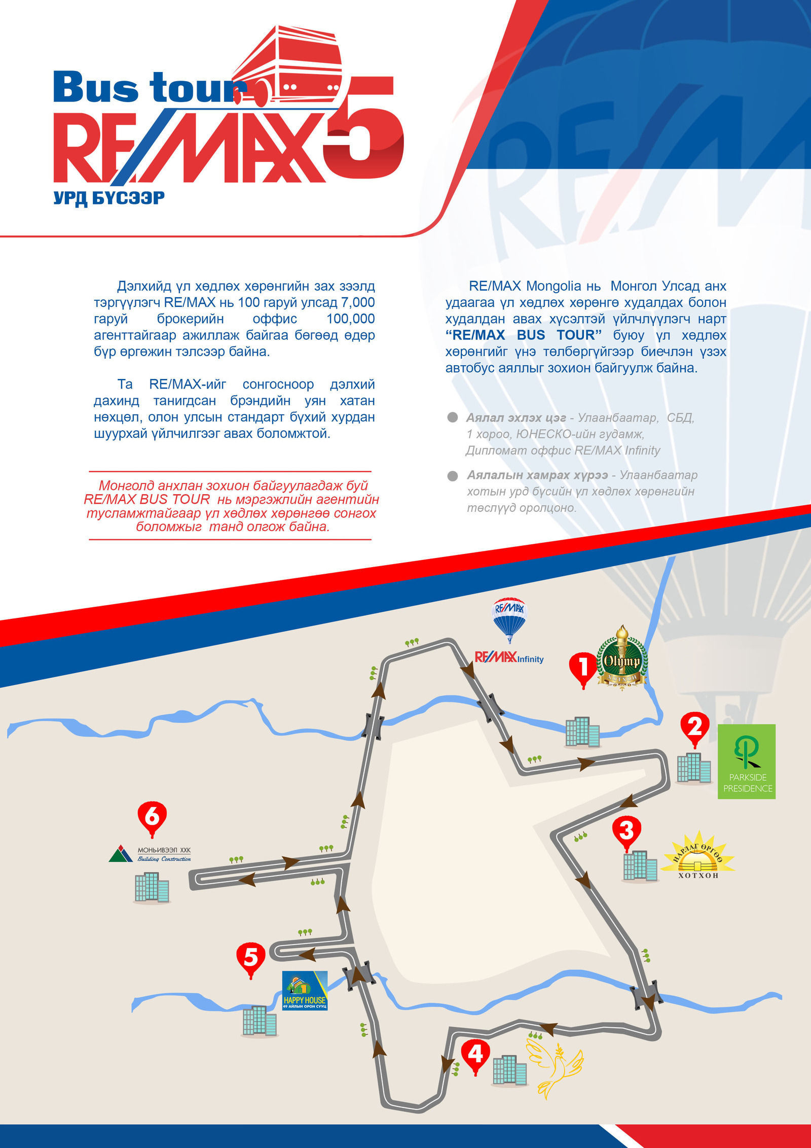 Энэ удаагийн аялалыг 13 р хороололд Дипломатын байрны 3 давхарт байрлах РЕМАКС ИНФИНИТИ оффис зохион байгуулсан бөгөөд ОЛОН УЛСЫН ЖИШИГ СТАНДАРТАД НИЙЦСЭН АВТОБУСТАЙ АЯЛАЛ (BUS TOUR)-аараа Улаанбаатар хотын Баянзүрх, Хан Уул дүүрэгт байрлалтай шилдэг төслүүд болох ОЛИМП ХОТХОН, ПАРКСАЙД РЕЗИДЕНС, НАРЛАГ ӨРГӨӨ, ЭНХЖИН ХОТХОН, ХАППИ ХАУС, ИВЭЭЛ зэрэг хотхонуудаар өглөөний 10:00-14:00, өдрийн 15:00-19:00 цаг хүртэл 2 ээлжээр үргэлжилж нийт 80 гаруй хүмүүс хамрагдлаа.
