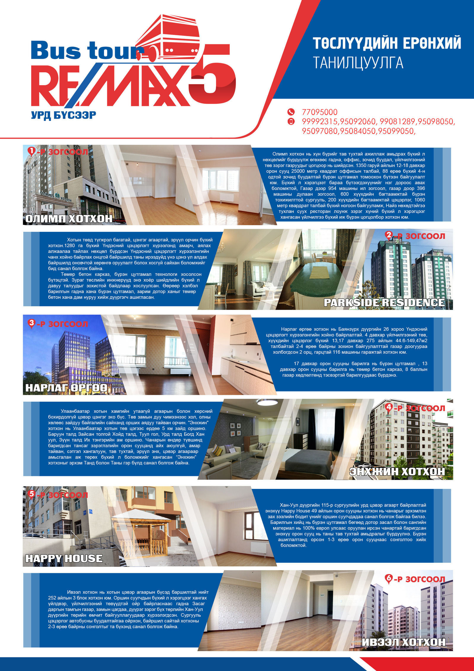 Үл хөдлөх хөрөнгө зуучлалын мэргэжлийн агентуудын хамт автобус аялалд хамрагдан төслүүдээр зочлох нь хэрэгцээтэй бүх мэдээллийг нэг дор авч, барилгуудыг бодит байдал дээр нь үзэж танилцан, өөрийн хэрэгцээнд тохирох эсэхийг нягтлах, үнэ төлбөр, худалдан авах БҮХИЙ Л БОЛОМЖУУДЫГ НЭЭЛТТЭЙ ЯРИЛЦАХ боломжийг танд олгож байгаа юм.