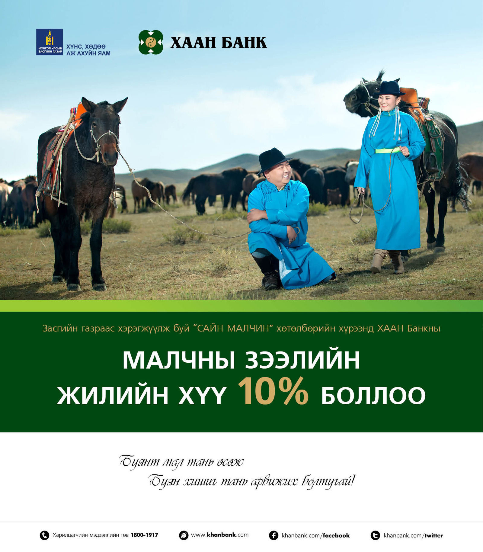 “Сайн малчин“ хөтөлбөрийн шаардлага хангасан, малчин данстай, эрүүл мэнд, нийгмийн даатгалд сайн дураар хамрагдсан, тарилга туулга, вакцинжуулалтад малаа бүрэн хамруулсан малчид ХААН Банкны өөрт ойр салбарт хандан жилийн 10%-ийн хүүтэй малчны зээлээ судлуулах боломжтой болж байна.