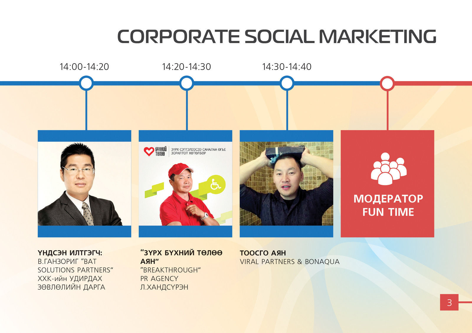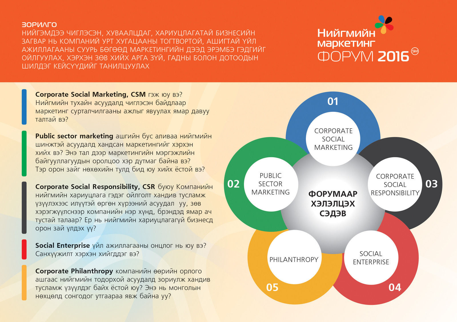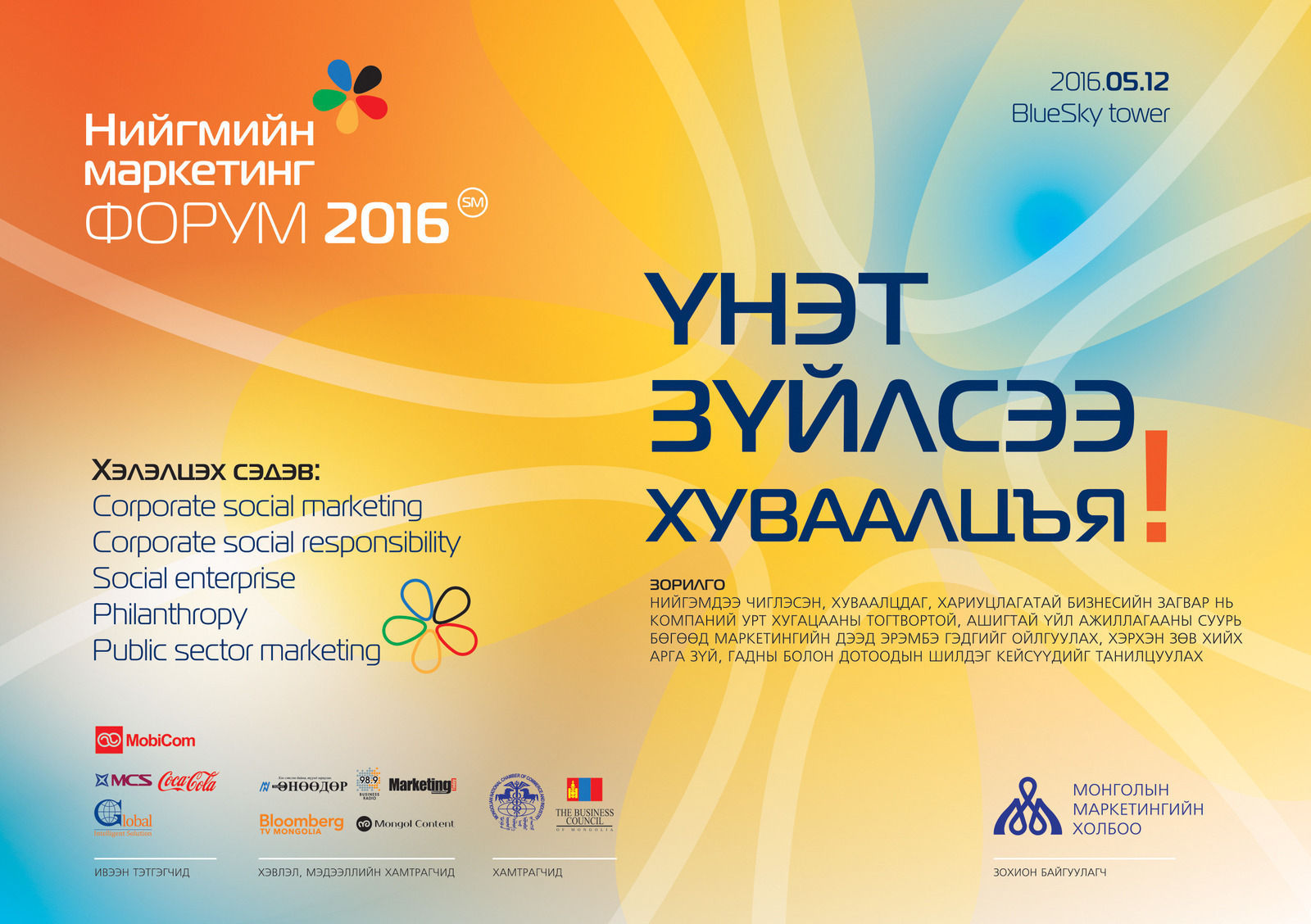 Энэ мэтчилэнгээр нийгмийн маркетингийг хэрхэн бизнесийн стратегийн нэг хэсэг болгох боломжтойг “Нийгмийн Маркетингийн Форум 2016”-д хүрэлцэн ирж танилцаарай.