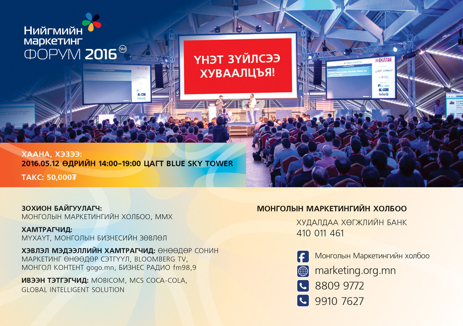 “Нийгмийн Маркетингийн Форум 2016” –д ЭНД дарж бүртгүүлнэ үү.