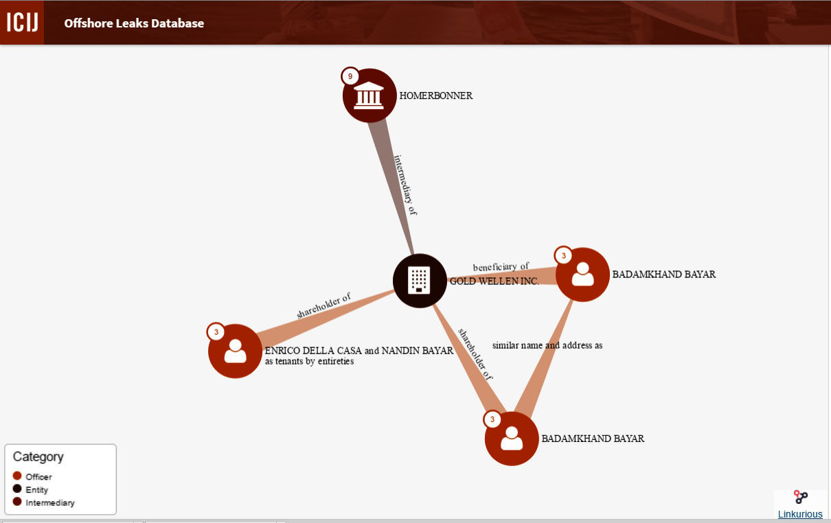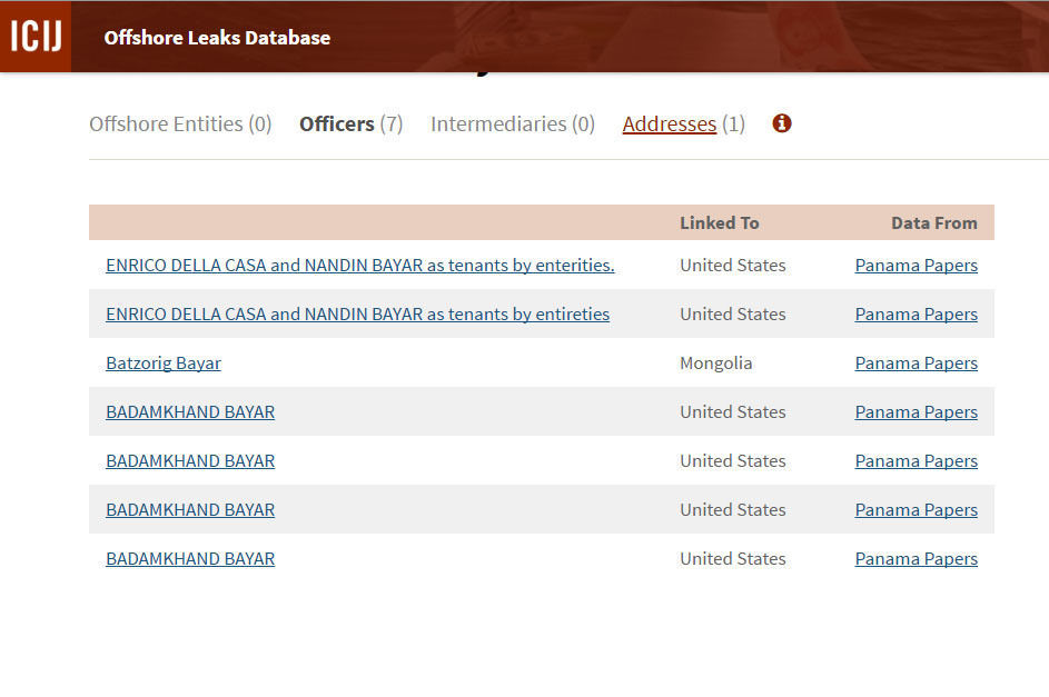 Тэгвэл Монгол хүмүүсийн мэдээлэл Монгол Улсын харьяаллаар хязгаарлагдахгүй нь. Бид нууц мэдээллээс хайлт хийхэд АНУ-д хамаарах хоёр Монгол хүний нэр гарч ирлээ. Баяр овогтой Нандин, Бадамханд нар нь Gold Wellen INC-д хувьцаа эзэмшдэг бөгөөд тус компани нь Британийн Виржини аралд бүртгэлтэй юм байна.