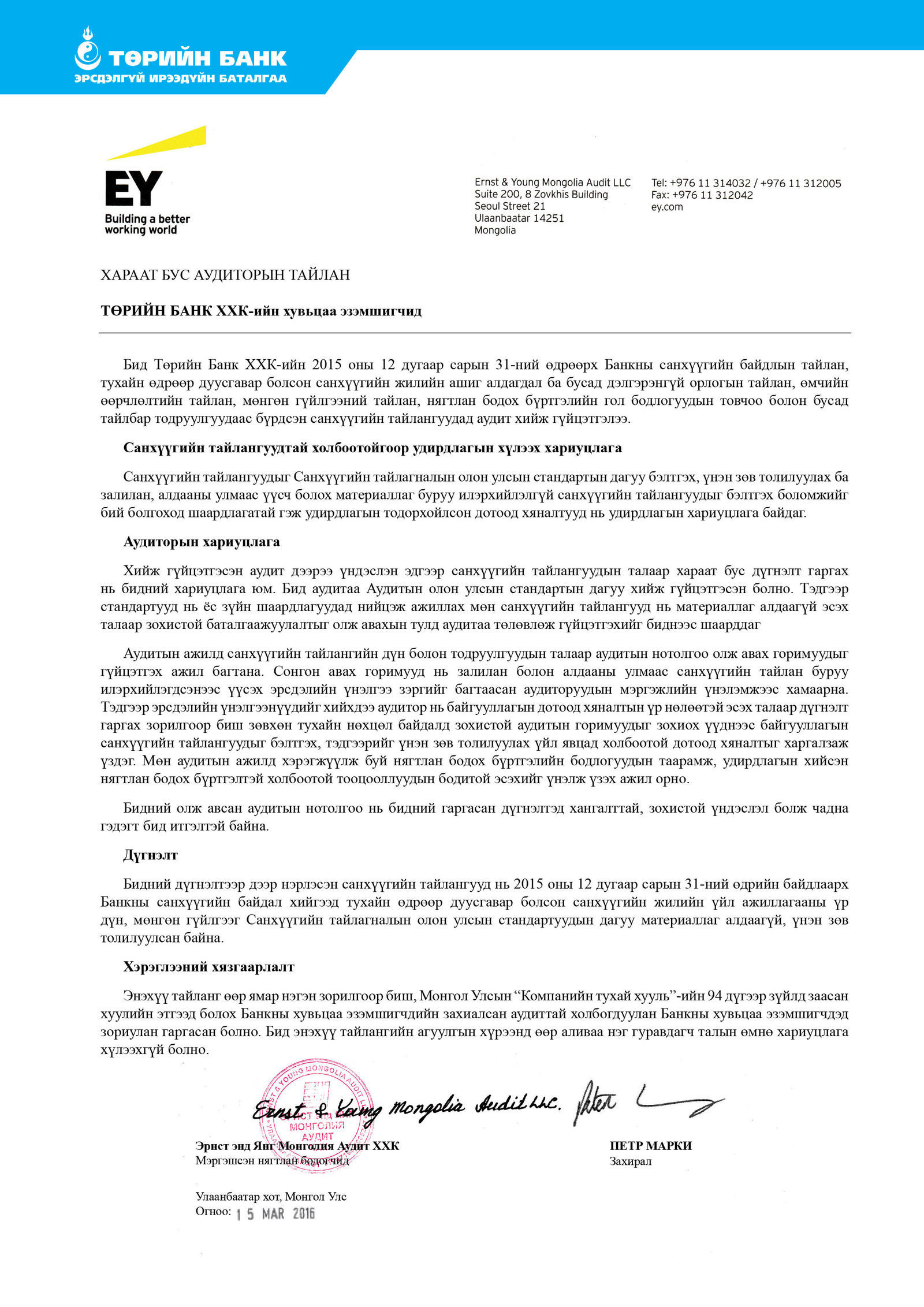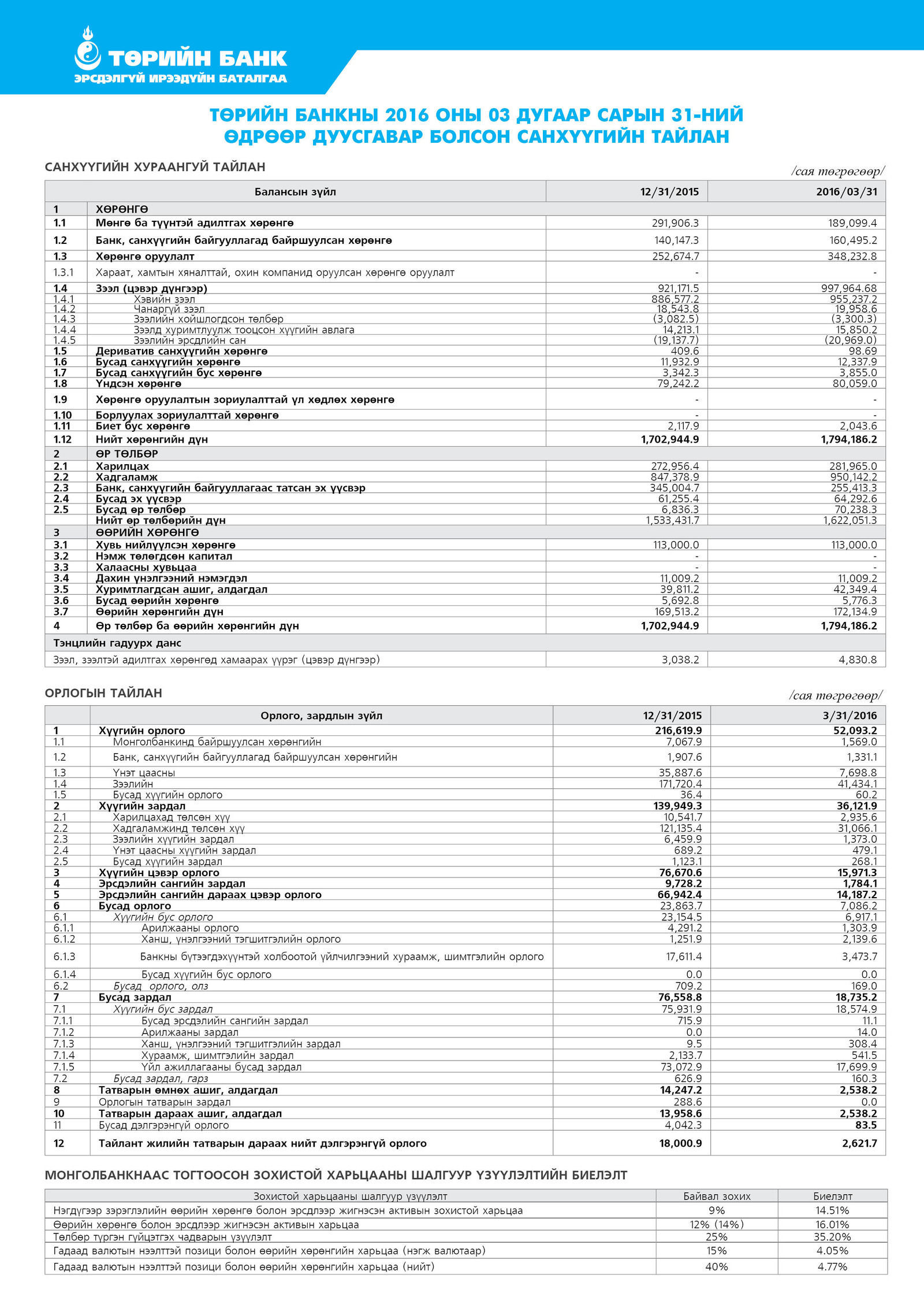 Төрийн банкны 2010, 2011, 2012, 2013, 2014, 2015 оны жилийн эцэс, 2016 оны 1 дүгээр улирлын санхүүгийн дэлгэрэнгүй тайланг дараах линкнээс харна уу. https://www.statebank.mn/w/mn/m505