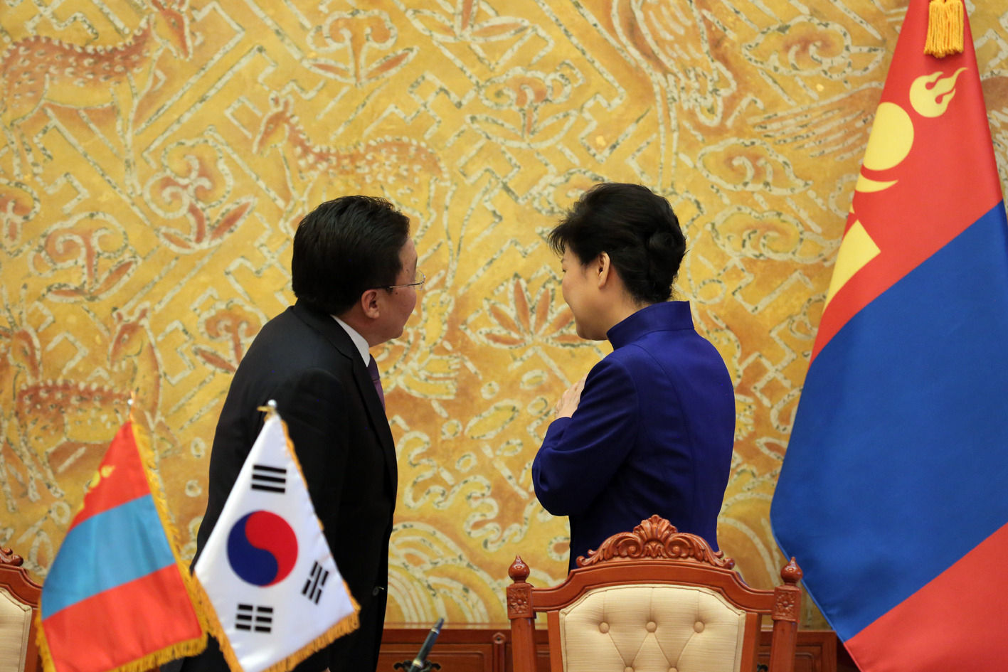 Монгол Улсын Ерөнхийлөгч Цахиагийн Элбэгдорж БНСУ-ын Ерөнхийлөгч Пак Гын Хэ нар албан ёсны хэлэлцээ хийлээ.