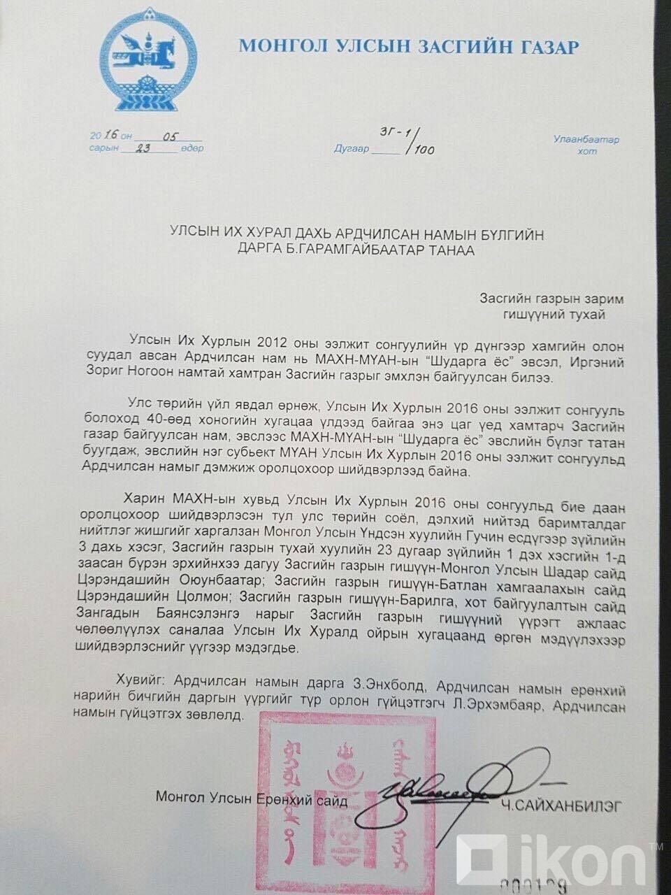 Ч.Сайханбилэгийн энэхүү албан бичгийг бүрэн эхээр нь хүргэж байна.