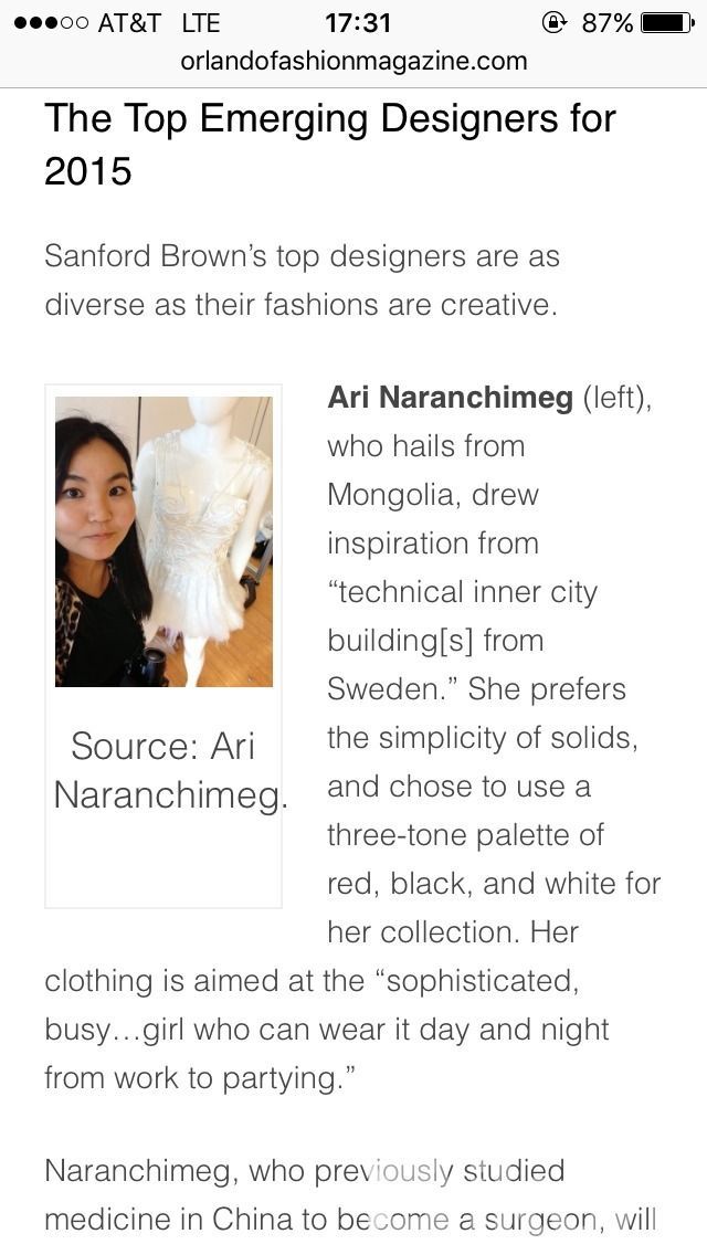 - Тийм. АНУ-ын тэмцээний хариу арваннэгдүгээр сард гарсан. Америкийг төлөөлж гурван дизайнер Vogue Talent-ын зохион байгуулсан REMIX2016 олон улсын үслэг эдлэлийн загварын тэмцээнд материалаа илгээх боломжтой болсон. Түүний нэг нь Ари Наранчимэг миний бие байсан.