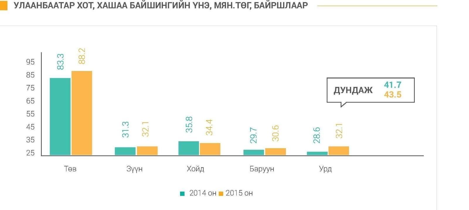 2015 оны 12-р сарын байдлаар хашаа байшингийн дундаж үнэ 43.5 сая төгрөг байлаа. Төвийн бүсэд хамгийн өндөр буюу 88.2 сая төгрөг, бусад бүсийн хувьд ойролцоо буюу 30-34 сая төгрөгийн үнэтэй гарсан.