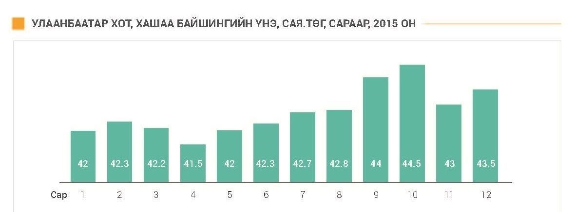 2015 оны хашаа байшингийн үнийг 1-12 сар тус бүрээр харьцуулан харахад 4-р сард хамгийн хямд буюу 41.5 сая төгрөг болж буурсан бол 8-10-р сард өсч, 10-р сард хамгийн өндөр үнэтэй буюу 44.5 сая төгрөгт хүрчээ.