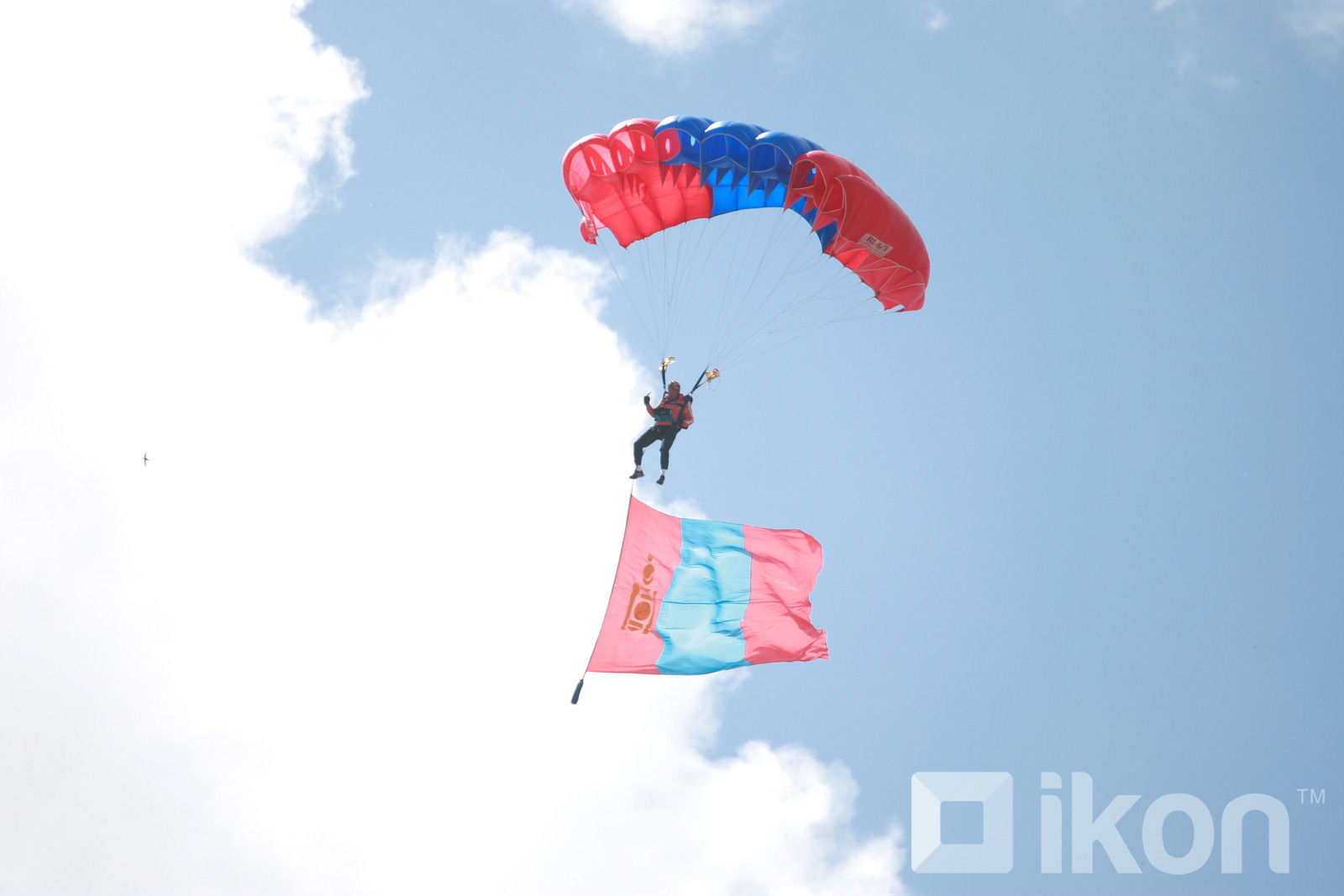 Наадмын нээлтийн төгсгөлд ОБЕГ-ын аврах тусгай ангийн шүхэрчид Монголын далбаатай шүхрээр төв цэнгэлдэх хүрээлэнгийн ногоон дэвжээнд буусан юм.