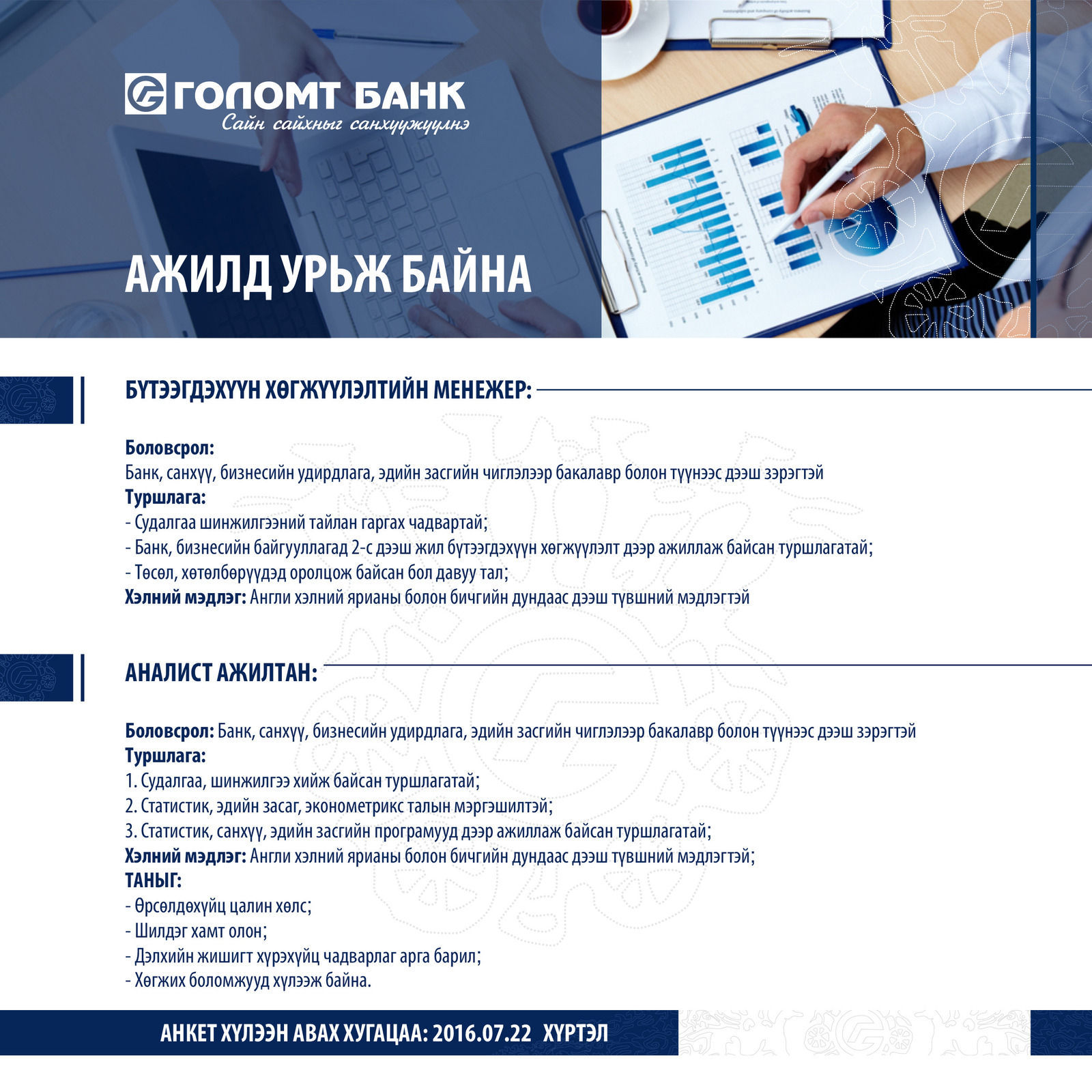 Голомт банк нээлттэй ажлын байранд урьж байна. Дэлгэрэнгүй мэдээллийг ЭНД дарж авна уу.