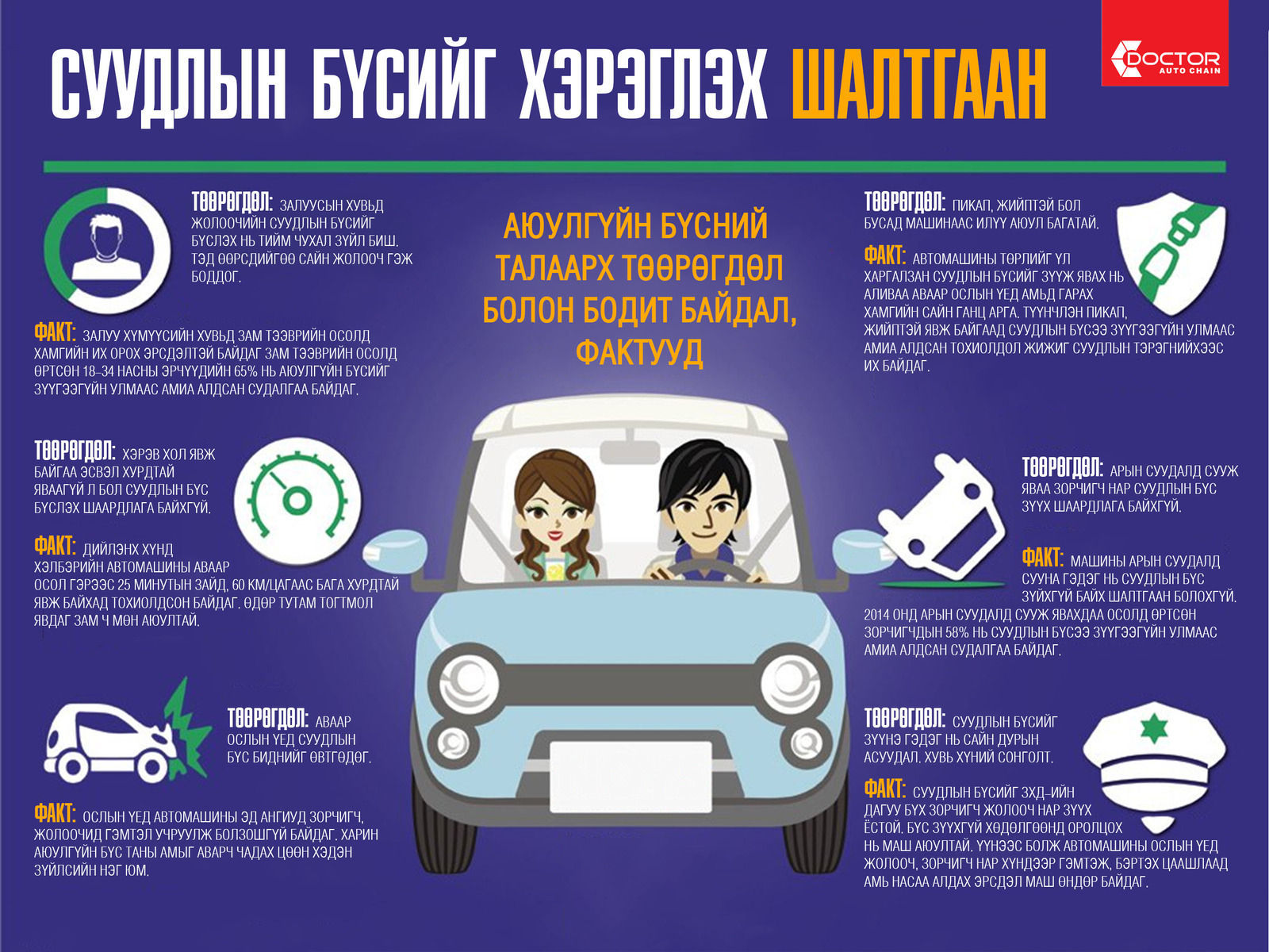 Факт: Машины арын суудалд сууна гэдэг нь суудлын бүс зүйхгүй байх шалтгаан болохгүй. 2014 онд арын суудалд сууж явахдаа осолд өртсөн зорчигчдын 58% нь суудлын бүсээ зүүгээгүйн улмаас амиа алдсан судалгаа байдаг.