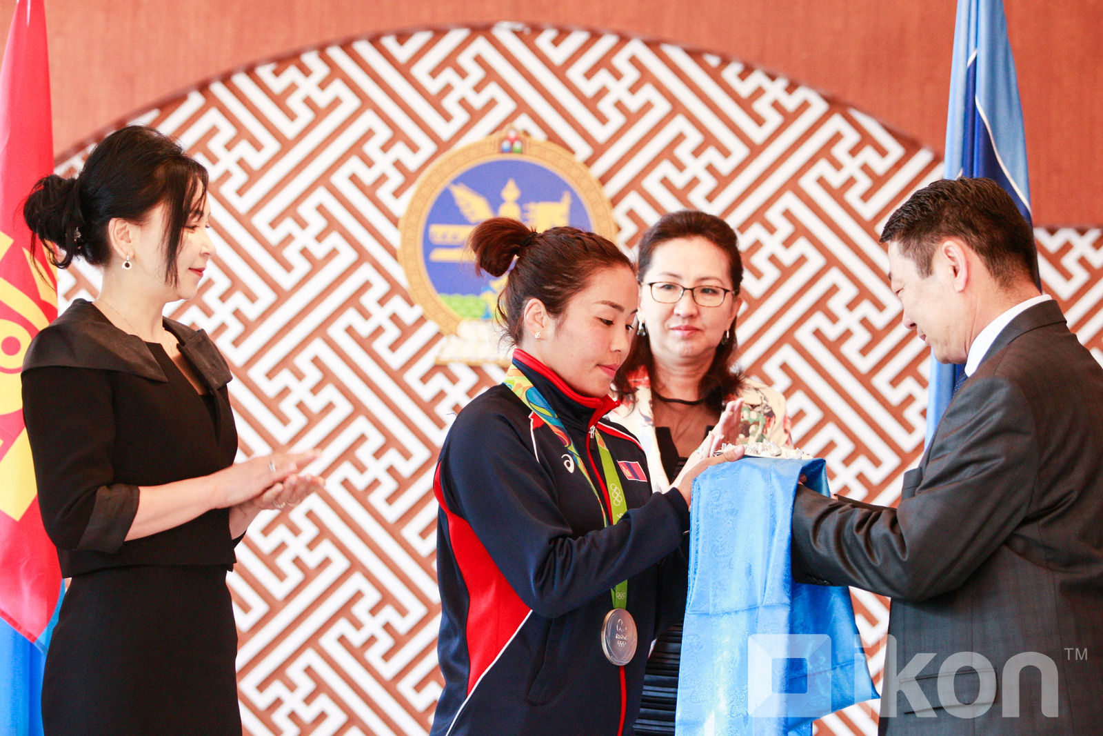 Олимпийн наадамд амжилт гаргасан мундаг бүсгүйг ирсэн даруйд нь БСШУС-ын сайд Ж.Батсуурь албан өрөөндөө мөнгөн аягатай сүү, алд цэнхэр хадгийн хамт угтан авч уулзлаа.