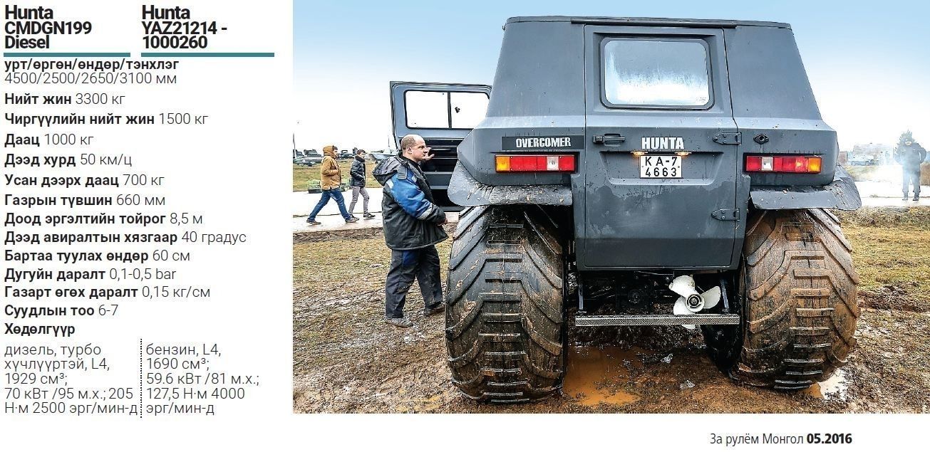 Хөдөлгүүрийн хувьд 1.9 литр Италийн CMD GN 199AT турбодизель, ВАЗ-ын 1.7литр бензин гэсэн 2 сонголтыг санал болгож байна. Монголд ирсэн HUNTA турбодизель хөдөлгүүртэй. Нийт жин 3.3 тонн, 1 тонн хүртэлх даацтай. Харин усан дээр бол 700кг тээвэрлэчихнэ. Усанд орсны дараа сэнсийг ажиллуулж яг л завь шиг хөвөөд явна. Энэ үед урд урд дугуй залуурын үүргийг гүйцэтгэнэ.