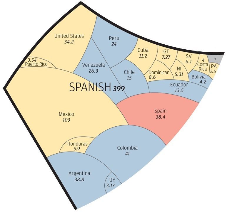 Латин Америкт Испани улс олон газар бүс нутгуудыг колончилж байсан нь өөрсдийн хэлээ түгээхэд том түлхэц болжээ. Одоогоор дэлхийд төрөлх Испани хэлтэй 35 орон байдаг бөгөөд 399 хүн тус хэлээр ярьдаг байна.