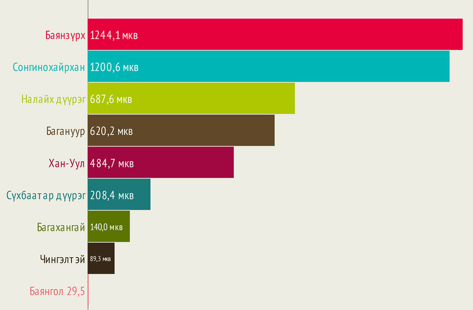 Хамгийн бага нь Багахангай 26, Багануур 44 бөгөөд Баянзүрх дүүрэг 232, Налайх 48, Сонгинохайрхан 216, Сүхбаатар дүүрэг 648, Хан-Уул дүүрэгт 255 хүн ногддог байна.