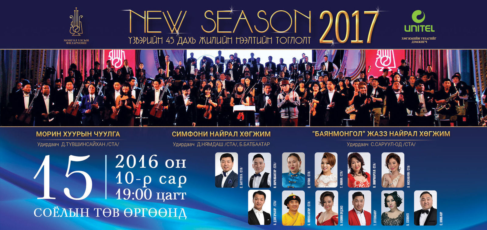 2017 онд Монгол Улсын Филармони үүсэн байгуулагдасны 45 жил, Симфони найрал хөгжмийн 60 жил, Морин хуур чуулгын 25 жилийн ой тохиож байгаараа 45 дахь үзвэрийн жилийн нээлтийн тоглолт онцлогтой болж байгааг Улсын Филармонийн дарга Ч.Даваасүрэн онцолж байлаа.
