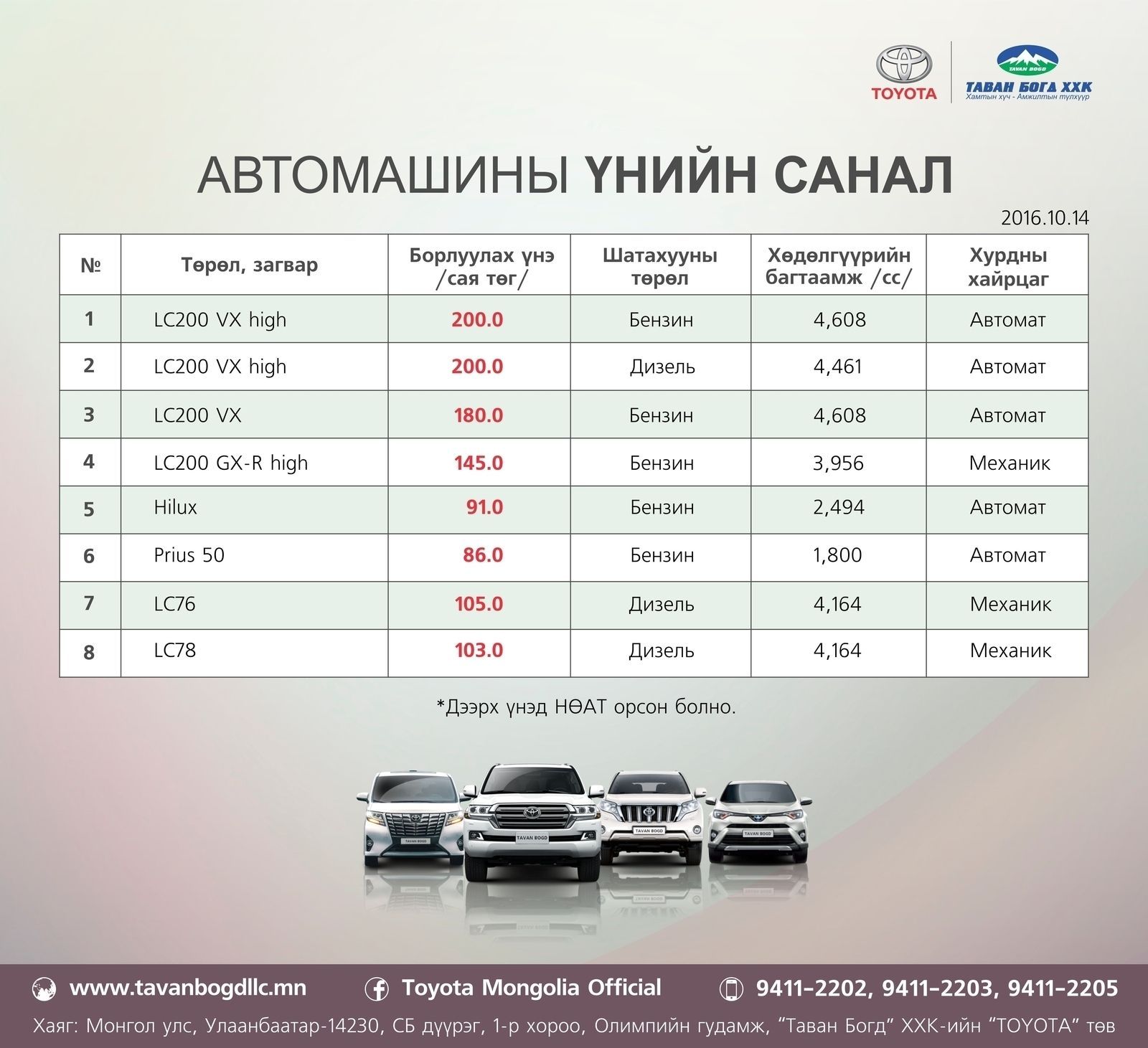 Toyota Motor Corporation-н Монгол дахь албан ёсны борлуулагч Таван Богд ХХК хэрэглэгчиддээ LC200, LC Prado, LC 76,78,79, RAV4, Hilux, Alphard, Hiace, Camry, Prius автомашинуудыг үйлдвэрлэгчийн 3 жил 100,000 км-н баталгаат хугацаатай санал болгож байна.