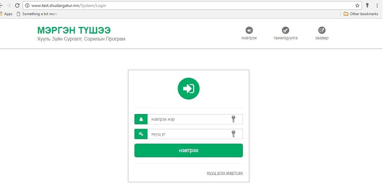 Хуульчийн сонгон шалгаруулалт, Төрийн албаны шалгалт өгөхөөр бэлтгэж байгаа залуустаа өөрийгөө сорих, туршилтын шалгалт өгөх боломж бүхий онлайн сургалт, сорилын "Мэргэн түшээ" програмыг санал болгож байна. Сорил өгөхийн хүсвэл http://www.test.shudargatur.