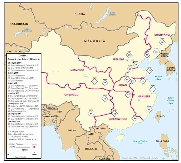 Бээжин ,Тяньцзиня, Шанхай , Гонконг хотын цэргийн гарнизоны бүрэлдэхүүнд 3 дивиз , 3 эргийн хамгаалалтын, 2 явган цэргийн бригадууд мөн нисдэг тэрэгний болон тэнгисийн явган цэргийн тусгай хороо ч хуурай замын цэргийн бүрэлдэхүүнд багтдаг байна.