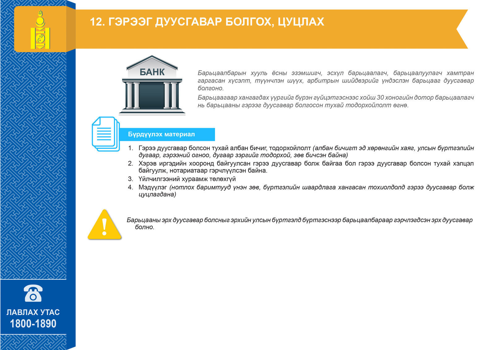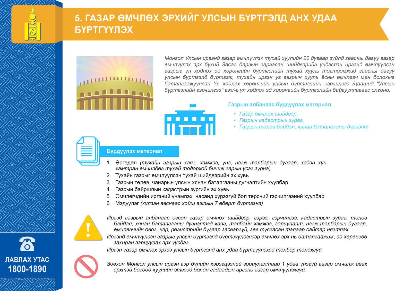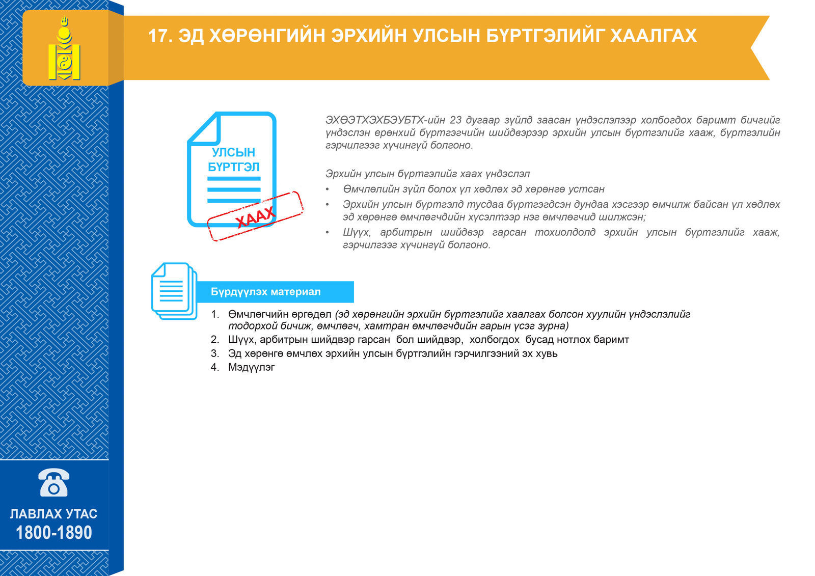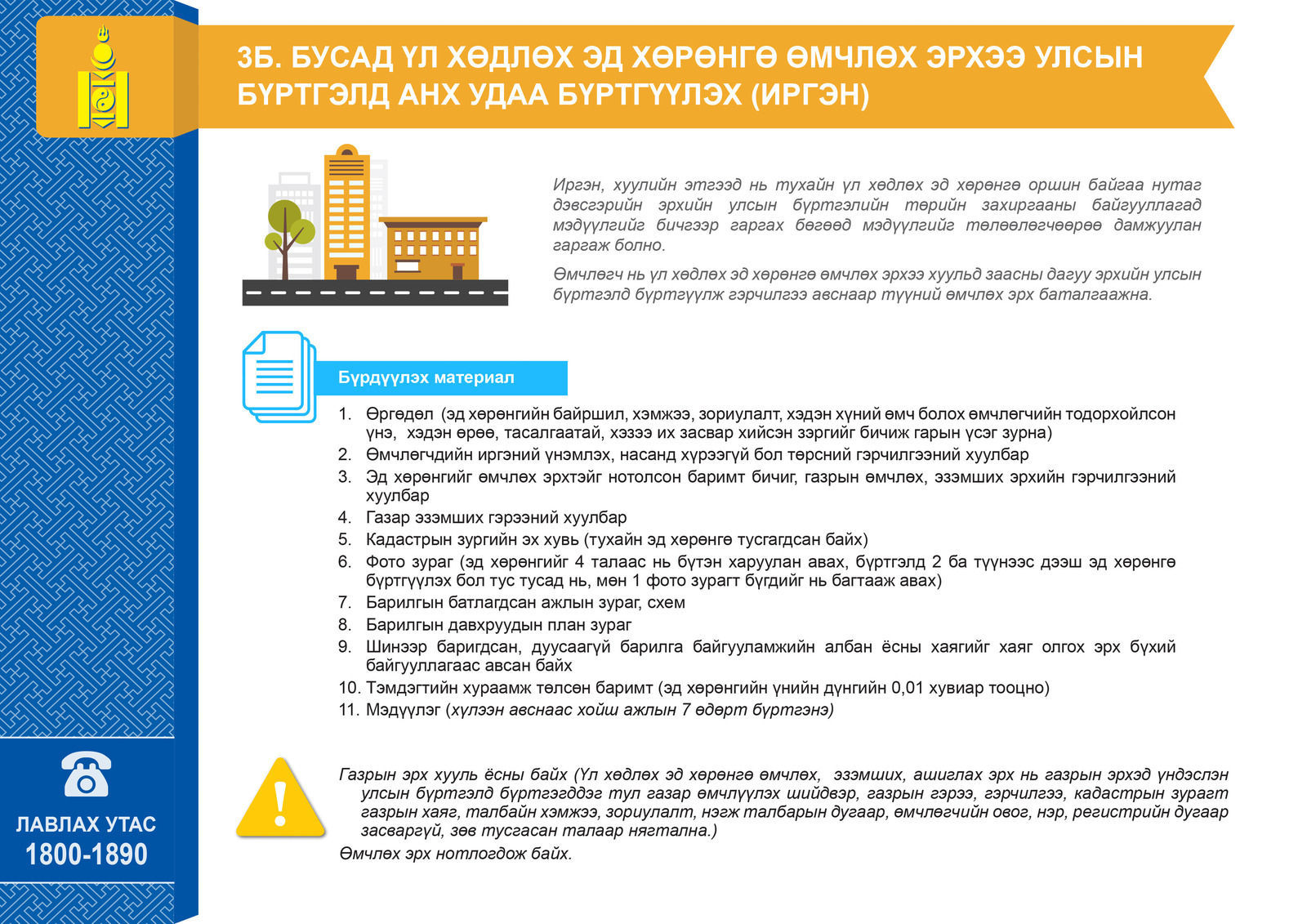 Оюуны Өмч Улсын Бүртгэлийн Ерөнхий Газраас эд хөрөнгийн эрхийн улсын бүртгэлтэй холбоотой мэдээ мэдээлэл, бүрдүүлэх материалын жагсаалтыг танилцуулжээ.