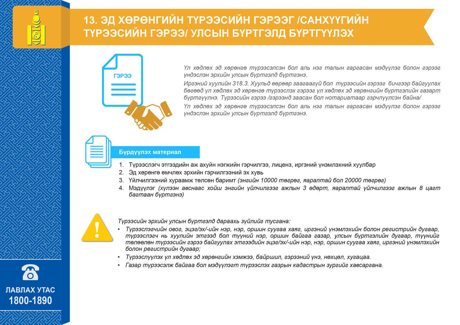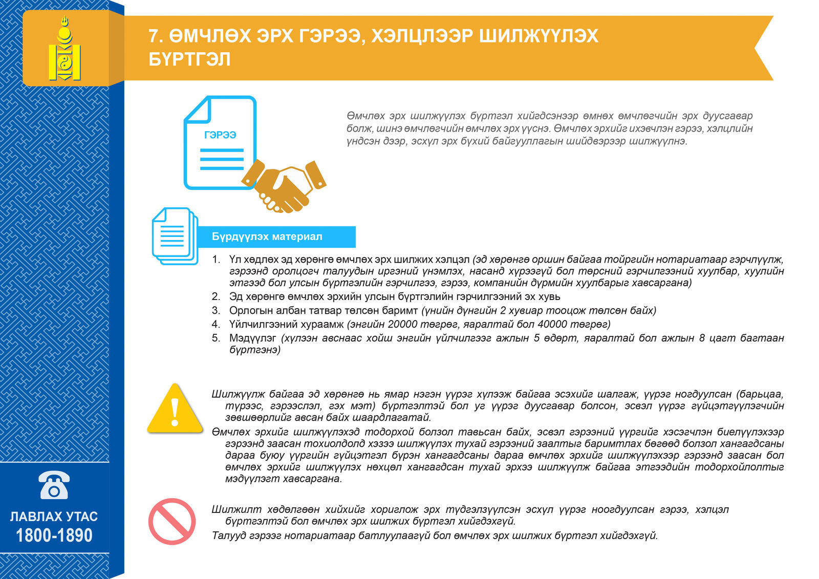 Үл хөдлөх хөрөнгө болон газраа хэрхэн өөрийн болон бусдын нэр дээр бүртгүүлэх, шилжүүлэх талаар 17 тохиолдлын зөвлөмжийг хүргэж байна.